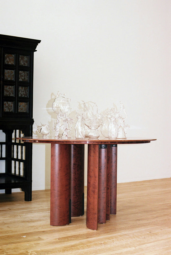 VCS: Yes, that's part of the game! I think it will be interesting to see how the red wine will look in the carafe or the decanter. I like the idea that the objects are beautiful, but not so reassuring. I'm really obsessed with a sort of fantasy, something like an invented situation in a movie. Movies like Death Becomes Her, or others from that time, where there is always a special bottle with an evil liquid inside, which is always emerald green or bright purple. It's never neutral! I always like a bit of exaggeration.