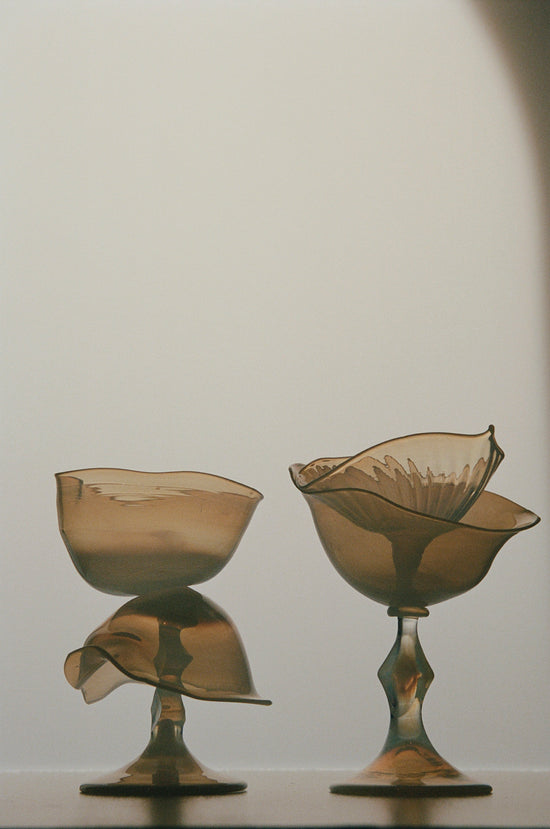 My idea for these glasses was to try to incorporate something very classic. Something that would also feel like a sense of evolution, but also decay. I was also quite fascinated by some glass from the Italian Renaissance, which I found a bit lumpy and unstable, even a bit goofy. I wasn’t interested in making something imperfect and ugly, but rather, I was happy to accept the fact that this part of the design process would produce a result that was somewhat out of my control.