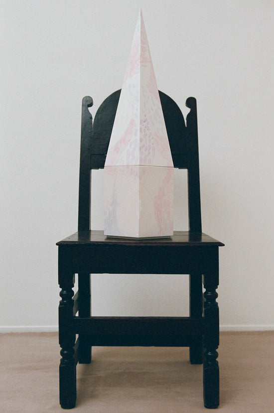 VC: For the boxes, I was inspired by my love of archival containers, which I like to consider as storage units. My concept was to create these weird shapes taken from hat boxes or architectural models and then paint on them to destroy that architectural gesture. The results remind me of textile pattern sketches. It was important to me that they were made incredibly well so they can age in a certain way. I always think of that scene in Titanic where the ship is flooding and all the objects from the cupboards start floating around. There is a sense of uselessness in what we’re doing that we have to accept. This is something I’m still struggling with.
