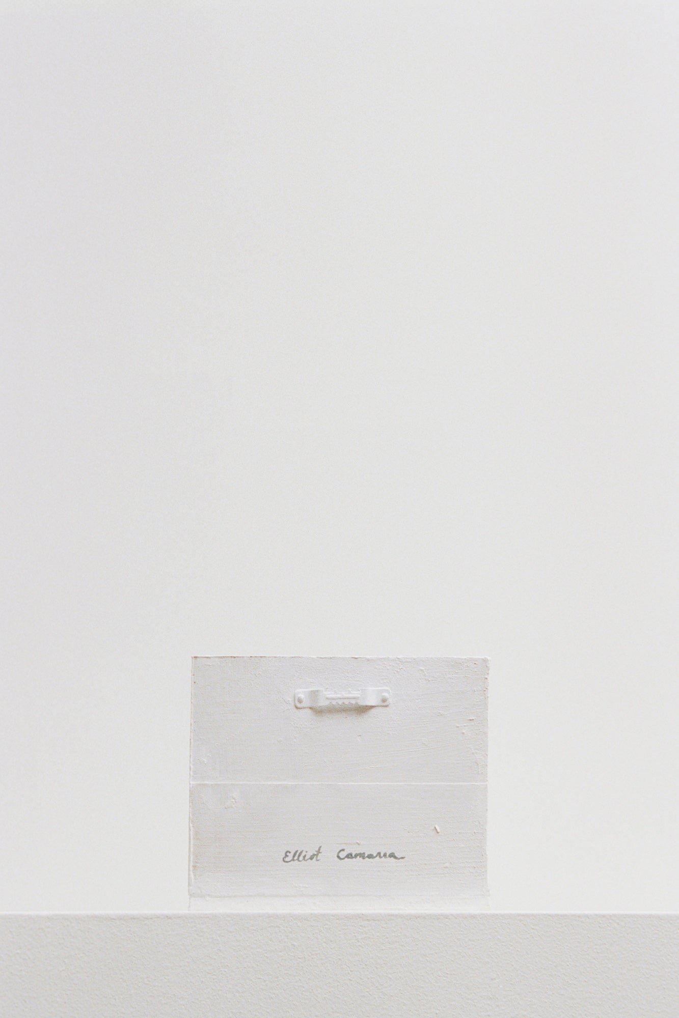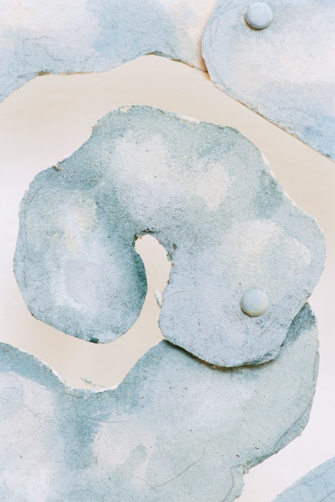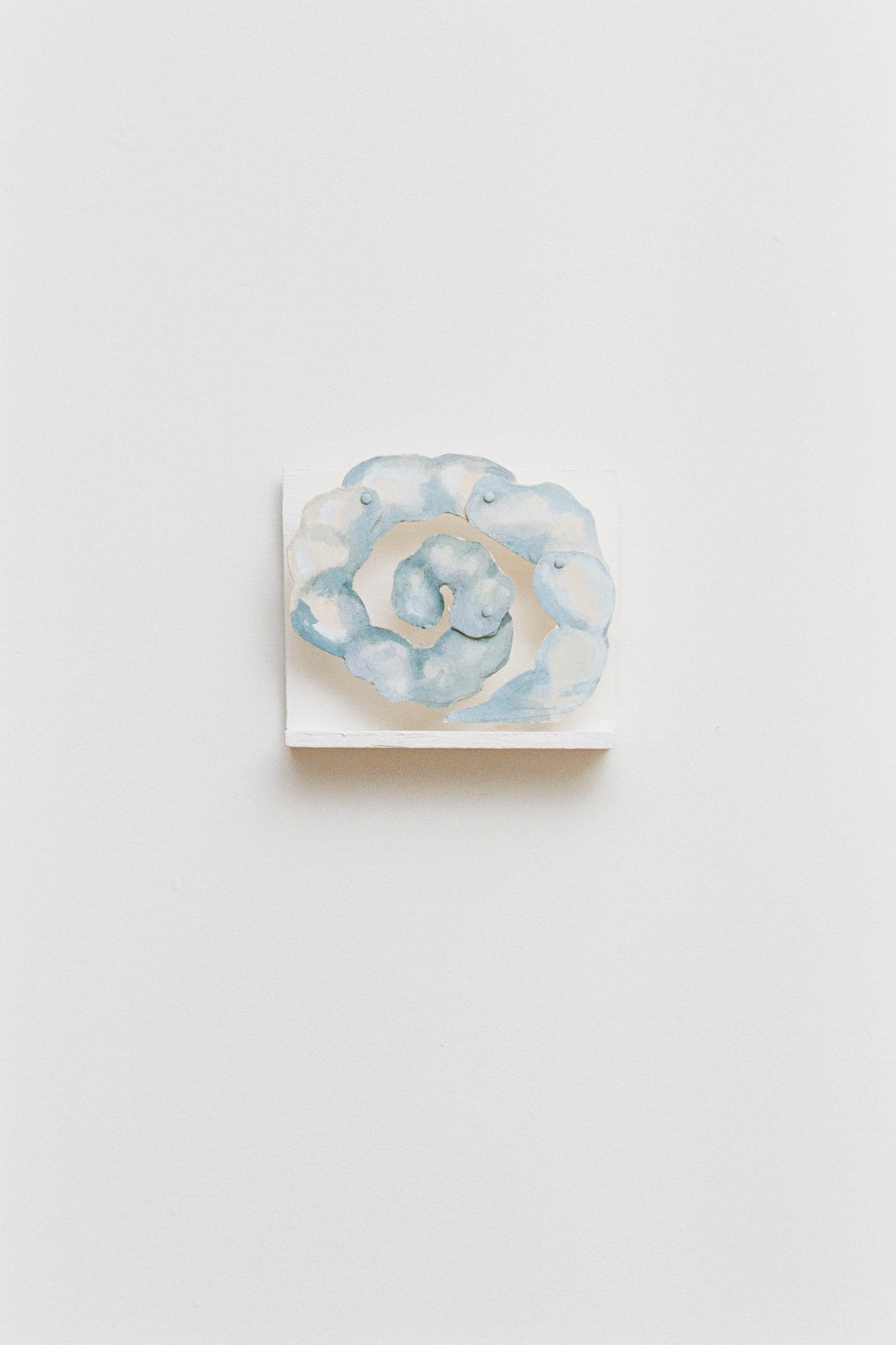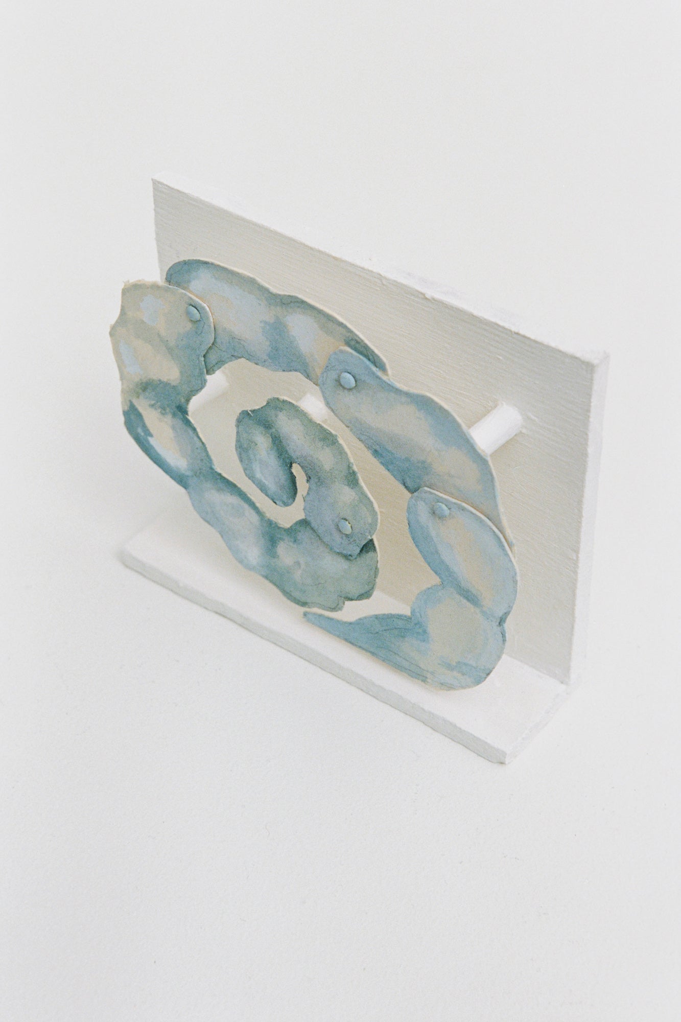 For “Play!”, artist Elliot Camarra’s works unfold around a loose narrative of a vessel far out at sea, where the horizon dissolves into a disorienting abstraction of water and sky. Subtle natural phenomena become harbingers of change, movement, and hope, guiding the imagined sailor through an otherwise endless landscape. This narrative is further articulated through sculptural forms that allude to the tradition of storytelling through stage scenery maquettes. A Stormy Sea series presents a cluster of shifting cloud formations, rendered as three painted paperboard elements linked together with metal pins, mounted against painted wooden backings. The works allude to the capricious nature of changing weather, as a source of great uncertainty and trepidation. Their shallow depths and layered compositions also recall theatrical scenery maquettes.