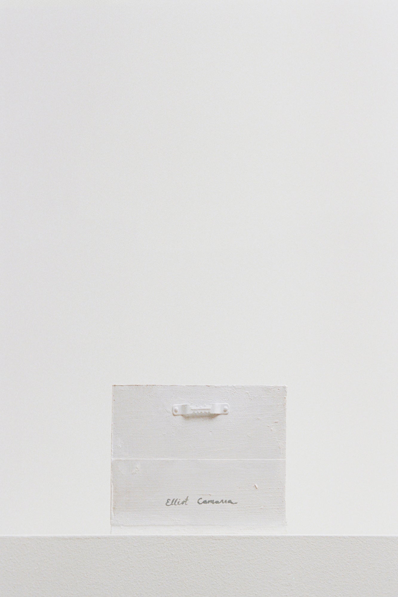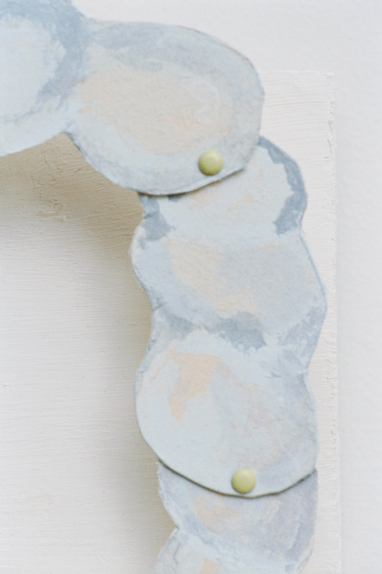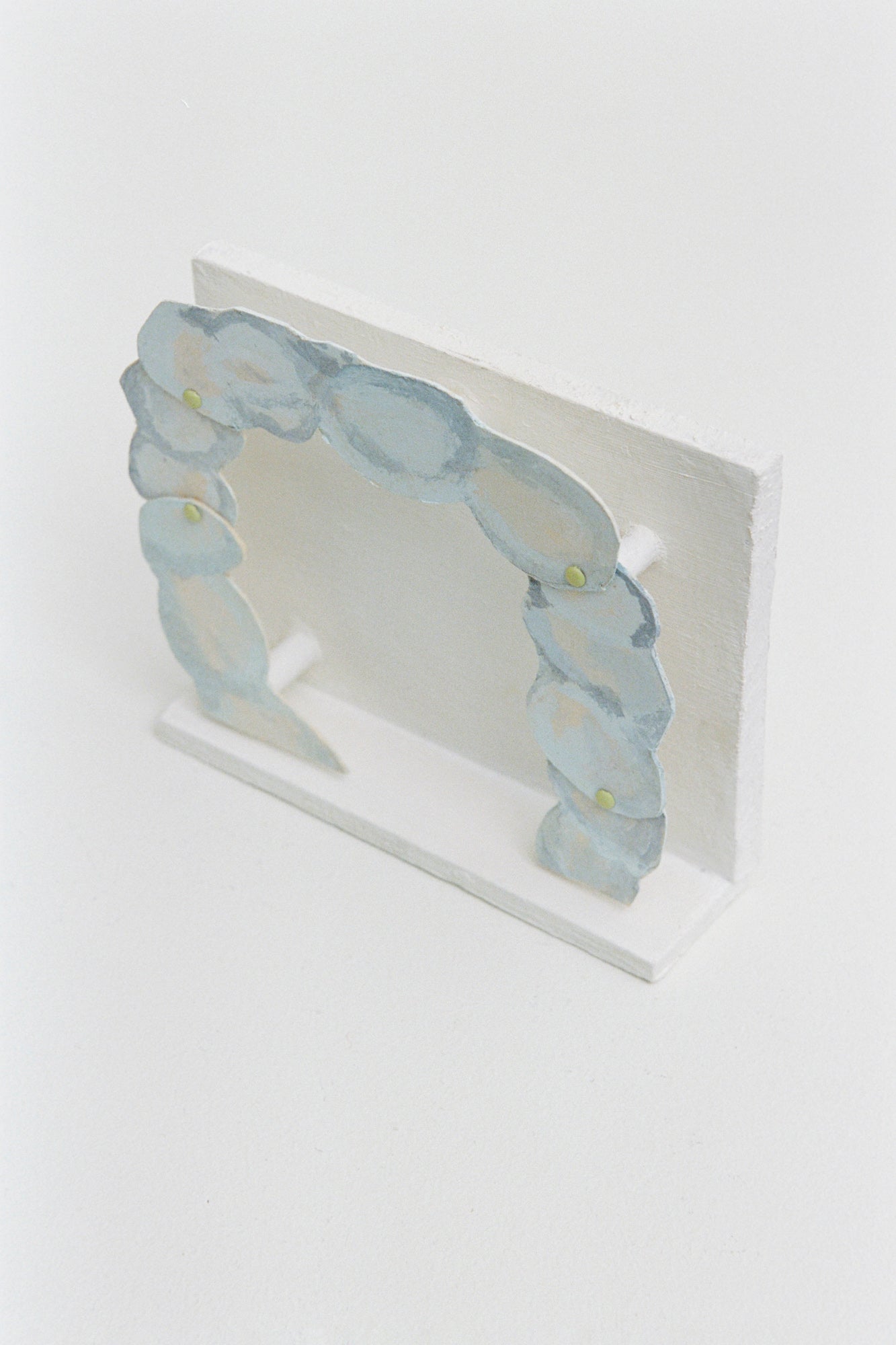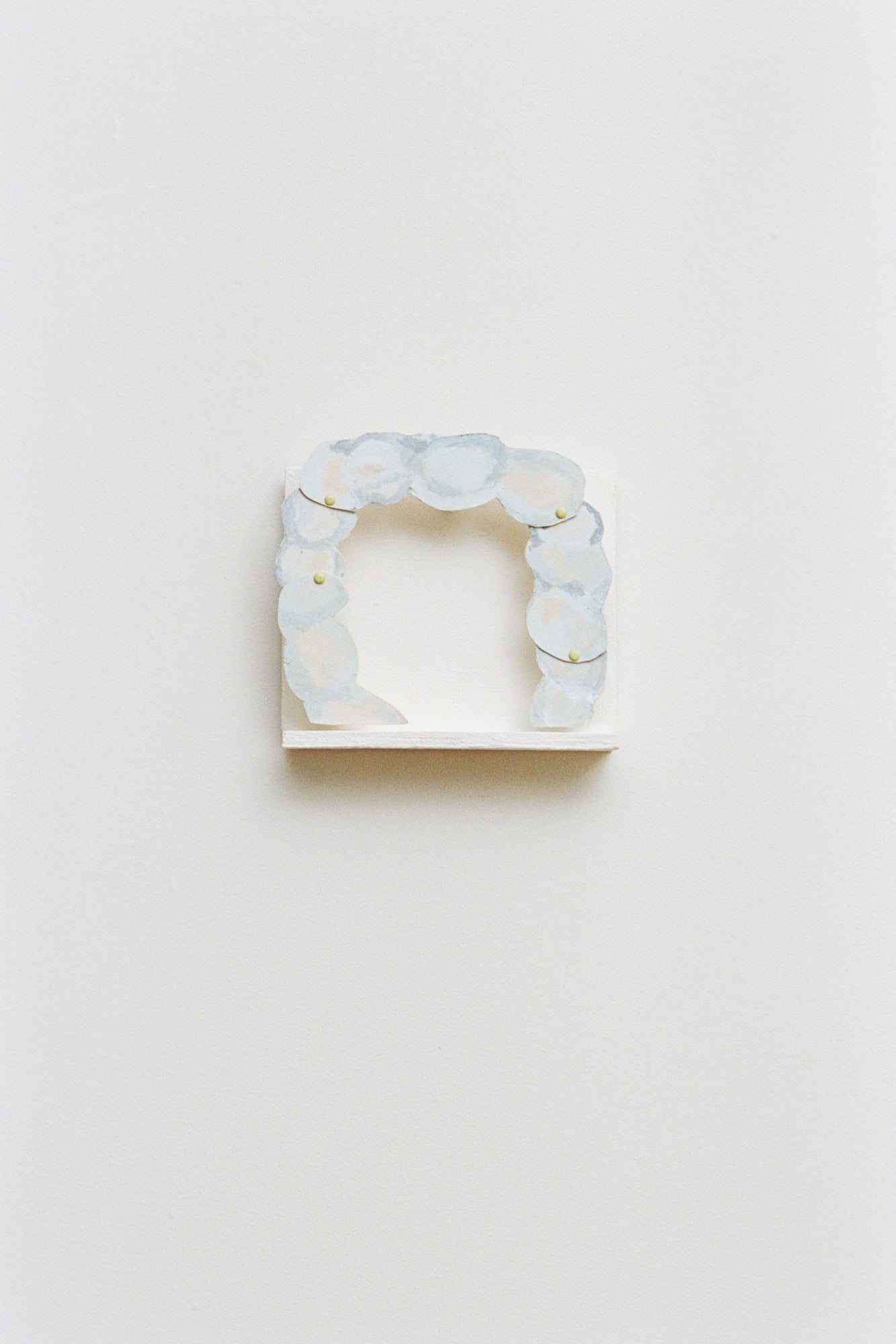 For “Play!”, artist Elliot Camarra’s works unfold around a loose narrative of a vessel far out at sea, where the horizon dissolves into a disorienting abstraction of water and sky. Subtle natural phenomena become harbingers of change, movement, and hope, guiding the imagined sailor through an otherwise endless landscape. This narrative is further articulated through sculptural forms that allude to the tradition of storytelling through stage scenery maquettes. A Stormy Sea series presents a cluster of shifting cloud formations, rendered as three painted paperboard elements linked together with metal pins, mounted against painted wooden backings. The works allude to the capricious nature of changing weather, as a source of great uncertainty and trepidation. Their shallow depths and layered compositions also recall theatrical scenery maquettes.