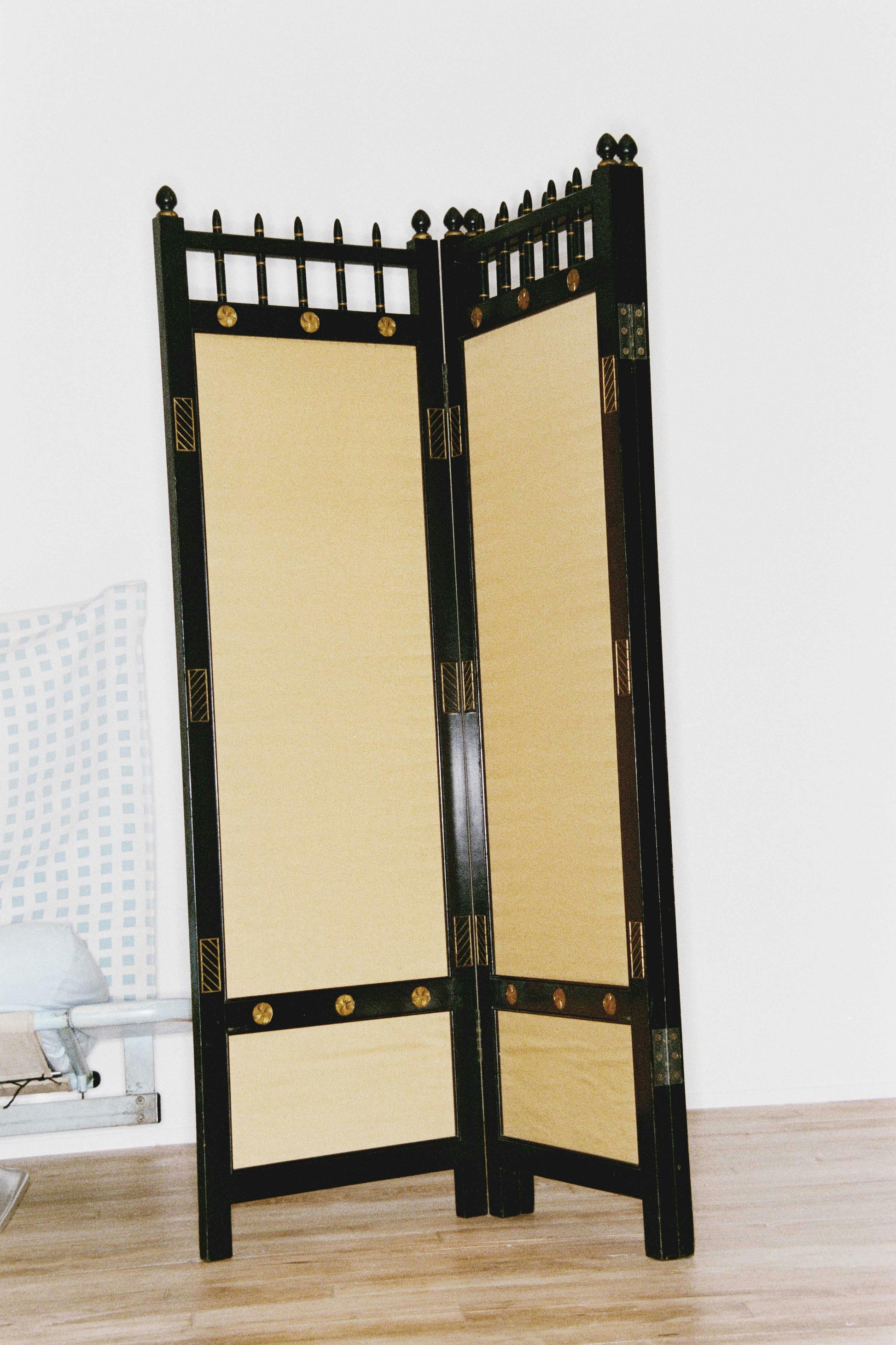 Friend to William Morris, Dante Gabriel Rosetti was a collector of antiques and would often share designs with Morris for his company to produce, as he too was looking at history for inspiration. The practical room divider may be something that Morris & Co. produced for Rosetti, as it presents something typical of the movement: quality craftsmanship and truth to materials. The mustard silk panels, reupholstered in c. 1920s, were once perhaps patterned with Morris printed textiles. The frame has been re-ebonised with glittering golden patterned highlights.