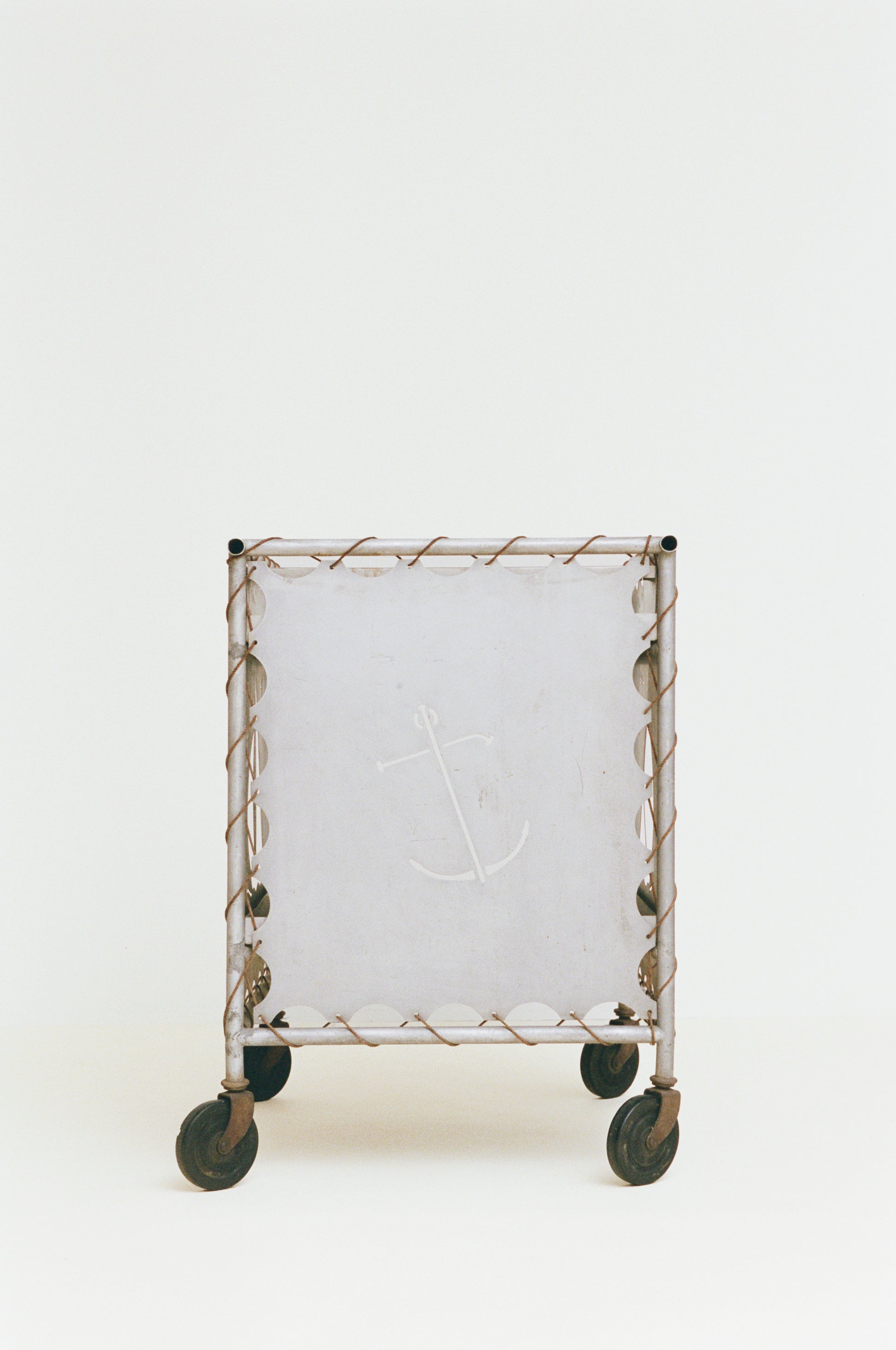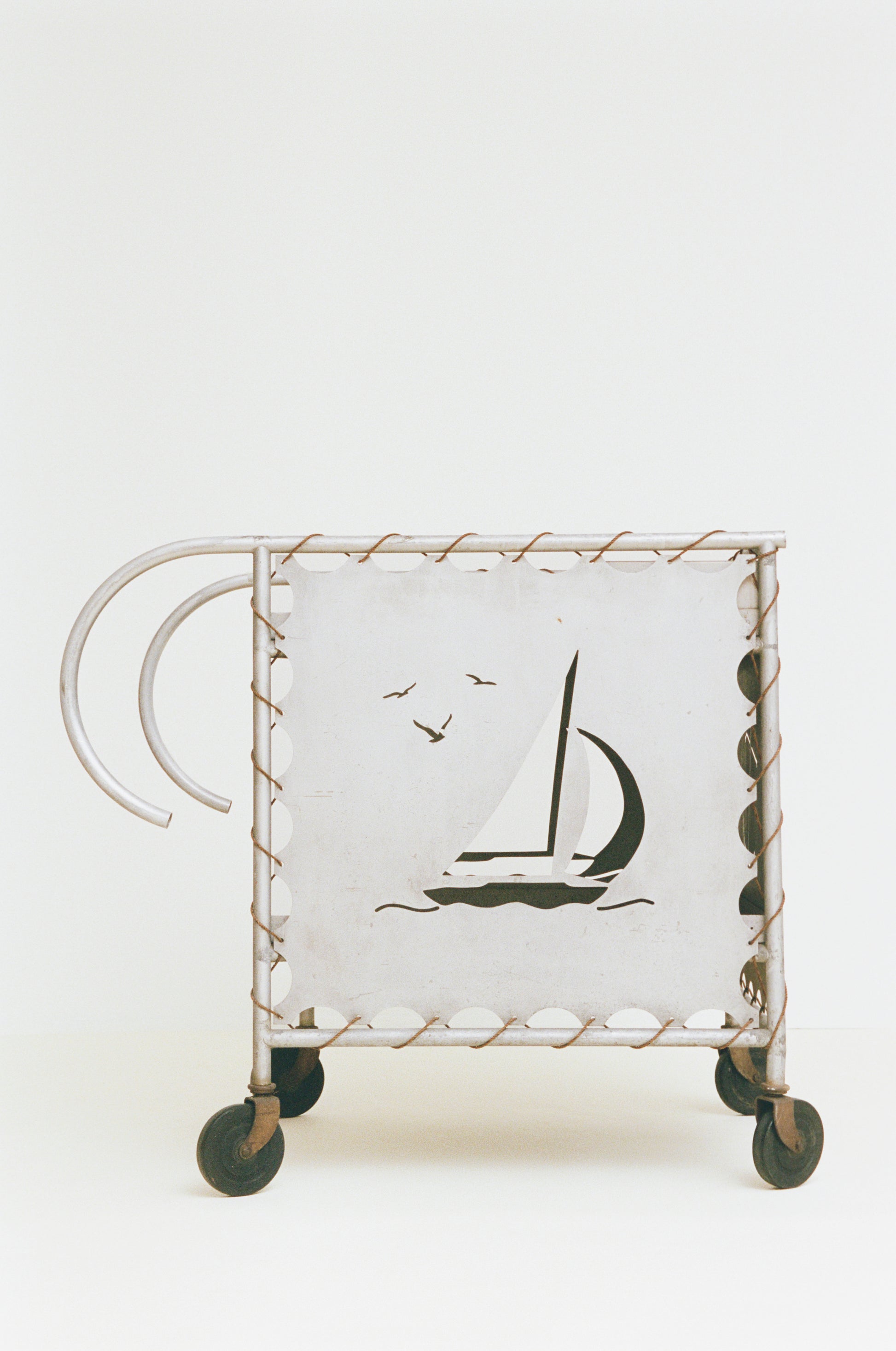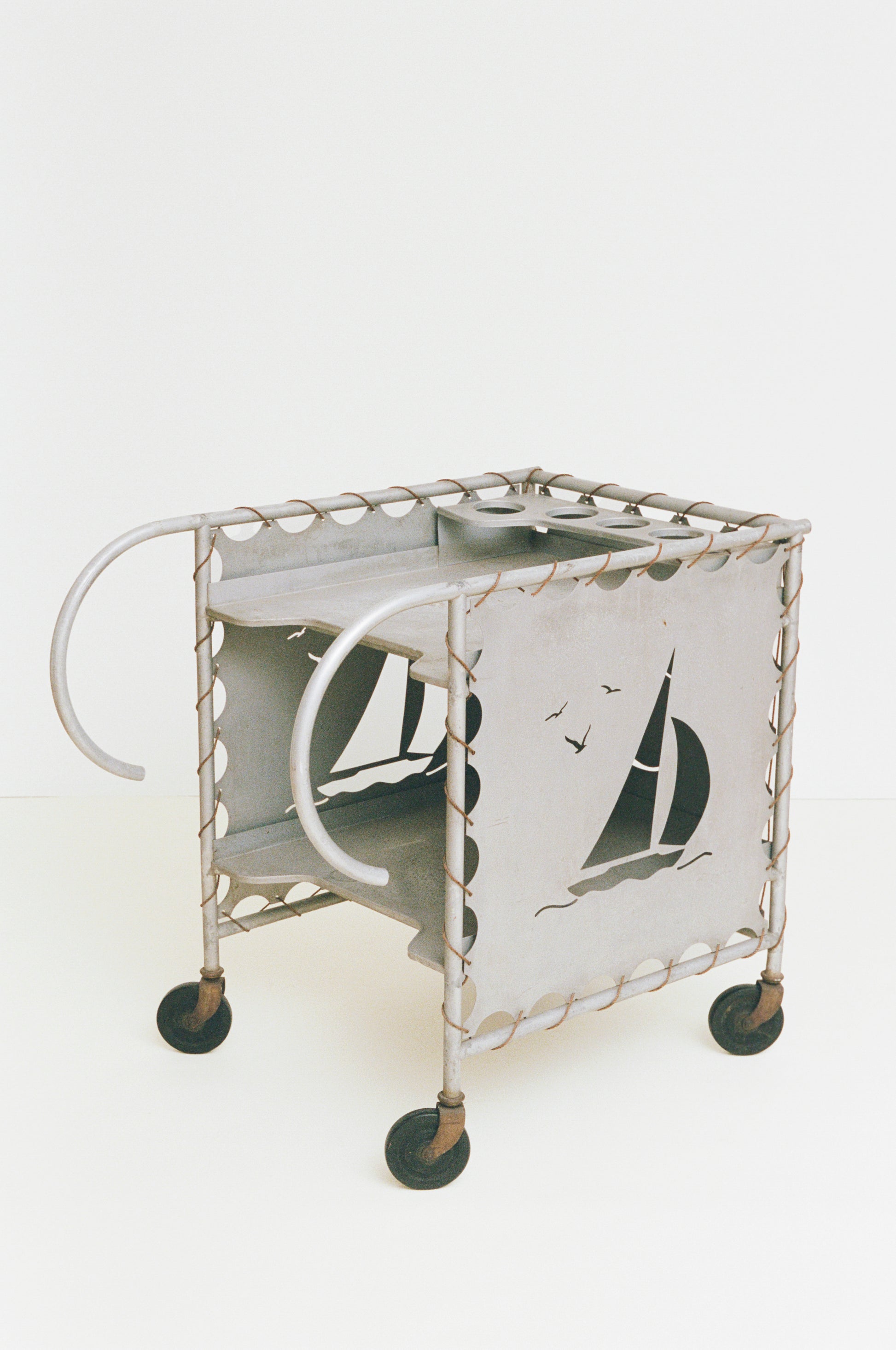 This large mid-century bar cart reflects a nautical design vocabulary characteristic of leisure-oriented domestic furniture and objects produced in the 1940s. Constructed from lightweight aluminum, the cart features a two-tier shelving system and an integrated bottle holder. Distinct, decorative cutouts of sailboats and anchors animate the side panels, which are secured to the frame using rope cordage – much like the rope systems that fasten sails to a mast. Resting on four rubber casters, the cart is designed for flexibility of movement, and most likely made a welcome presence on a hotel pool deck or seaside boardwalk.