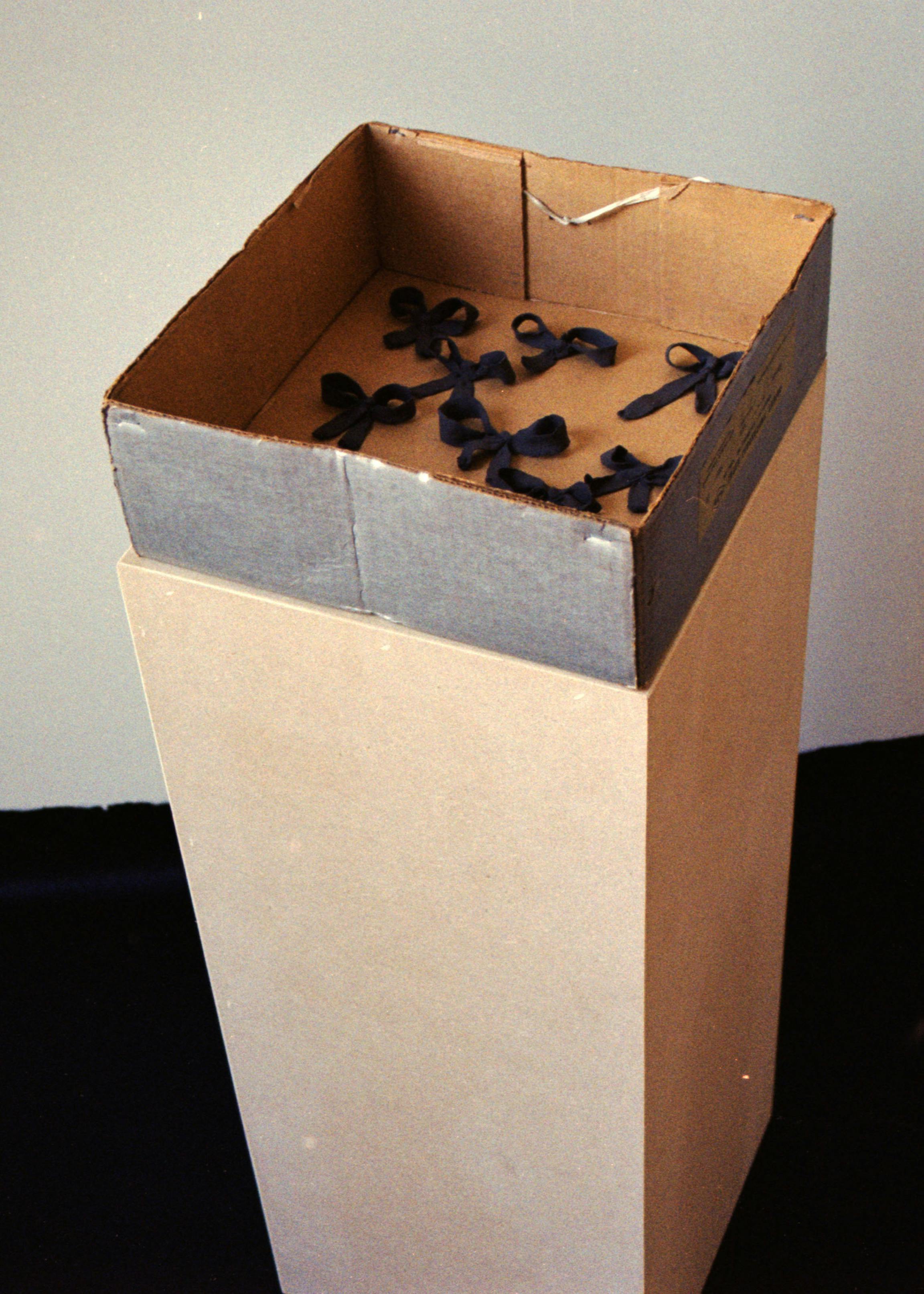Bonino’s work investigates notions of ephemerality and memory, ideas of fastening – closure, disclosure and the tensions inherent in the nature of seemingly disparate materials – those very tensions present within ourselves. This sculpture is composed of ceramic bows, plexiglass, glue and a found box.
