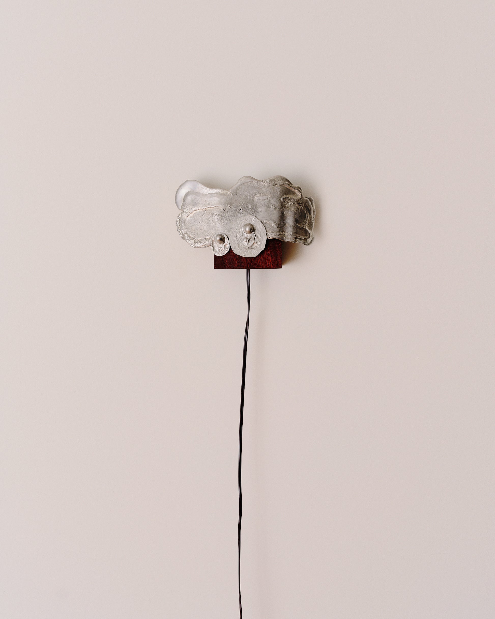 Each work in Crater Sconce Series was made by pouring sheets of pewter into a tray, manipulating it as it cooled to create unique surface textures and forms. Each shape was then carefully bent and mounted on a mahogany base, and secured with cast pewter hardware. The works – Tycho, Humbolt, Metius, Clavius – were named after craters on the moon. The surfaces evoke topographic maps – a cartography of abstracted landscapes or dioramas viewed from above. Through this aerial perspective, the series balances sculptural exploration with composition, inviting contemplation of terrain, elevation, and natural forms. If viewed from a linear perspective, the works can be seen as compositions or landscapes.