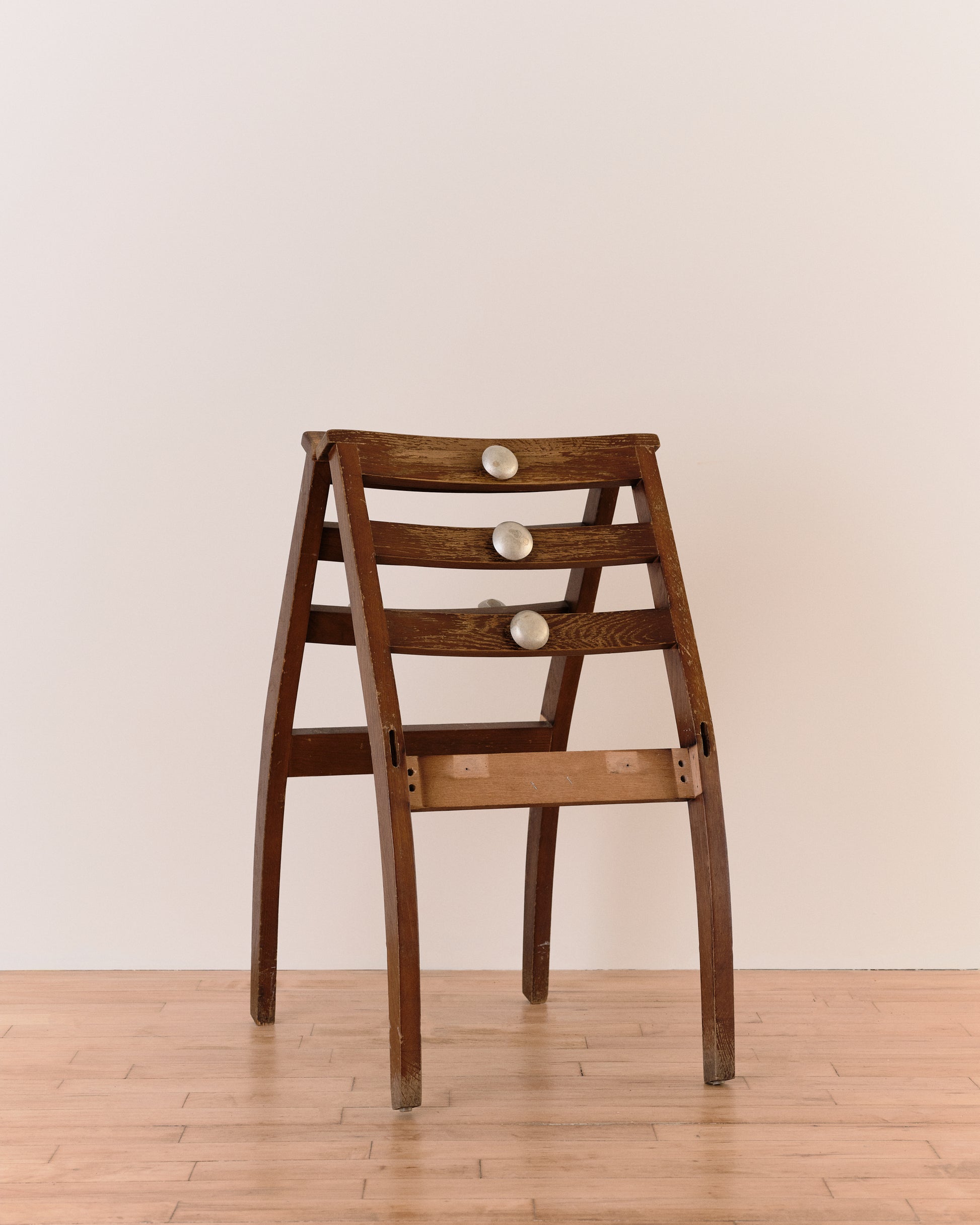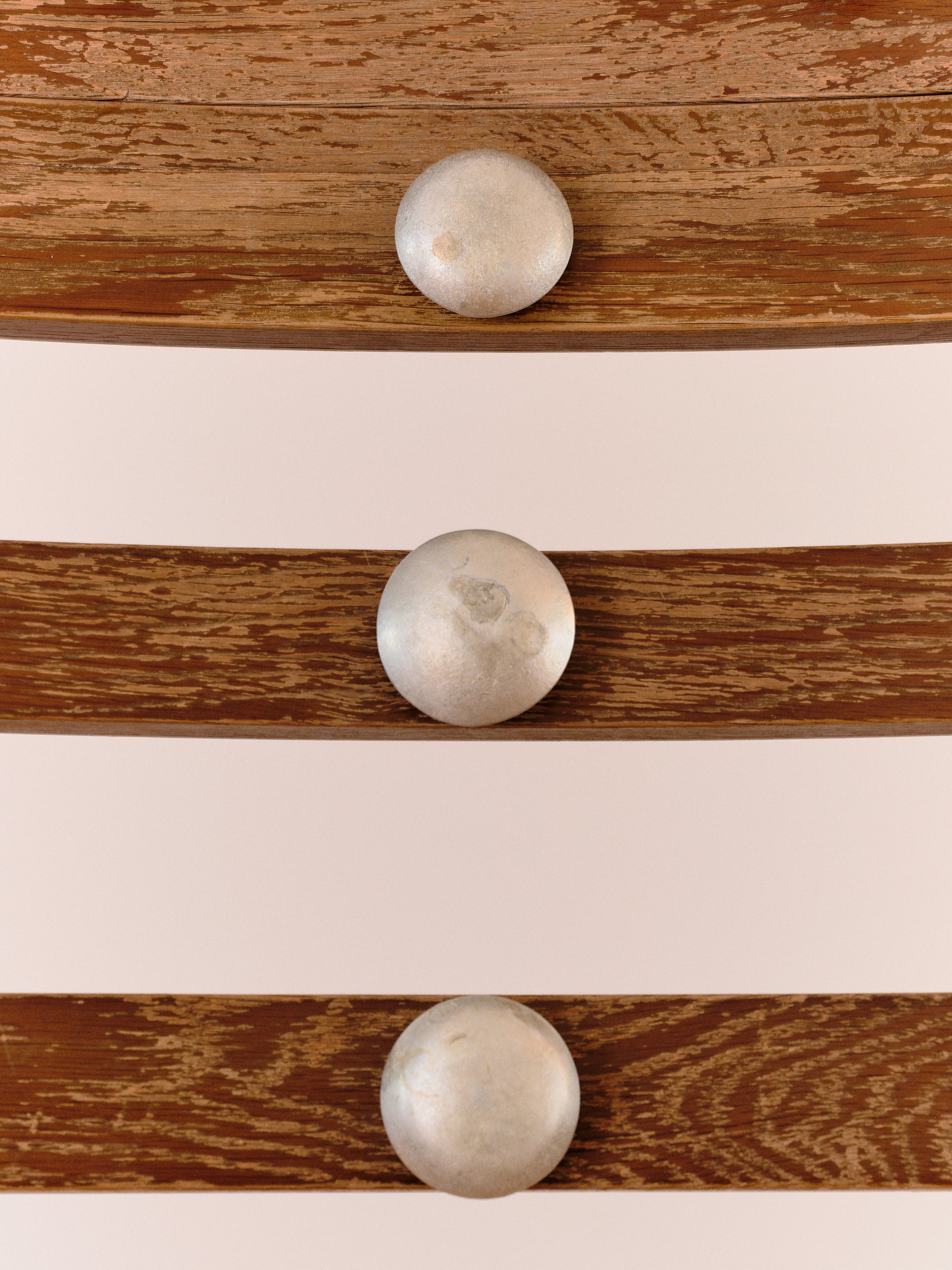 Each Pommel Knob is cast in a round mold over spare pewter castings. The knobs acquire unique textures and patinas through shifting conditions of temperature and shape. The title “Pommel” recalls both the weighted knob of a sword hilt and the front unturned grip of a horse saddle. Though these reference functional parts of utilitarian objects, they have also historically been opportunities for adornment. Thoughtfully handmade, the editioned pieces exhibit subtle variations, and the threading can be customized to suit specific projects.