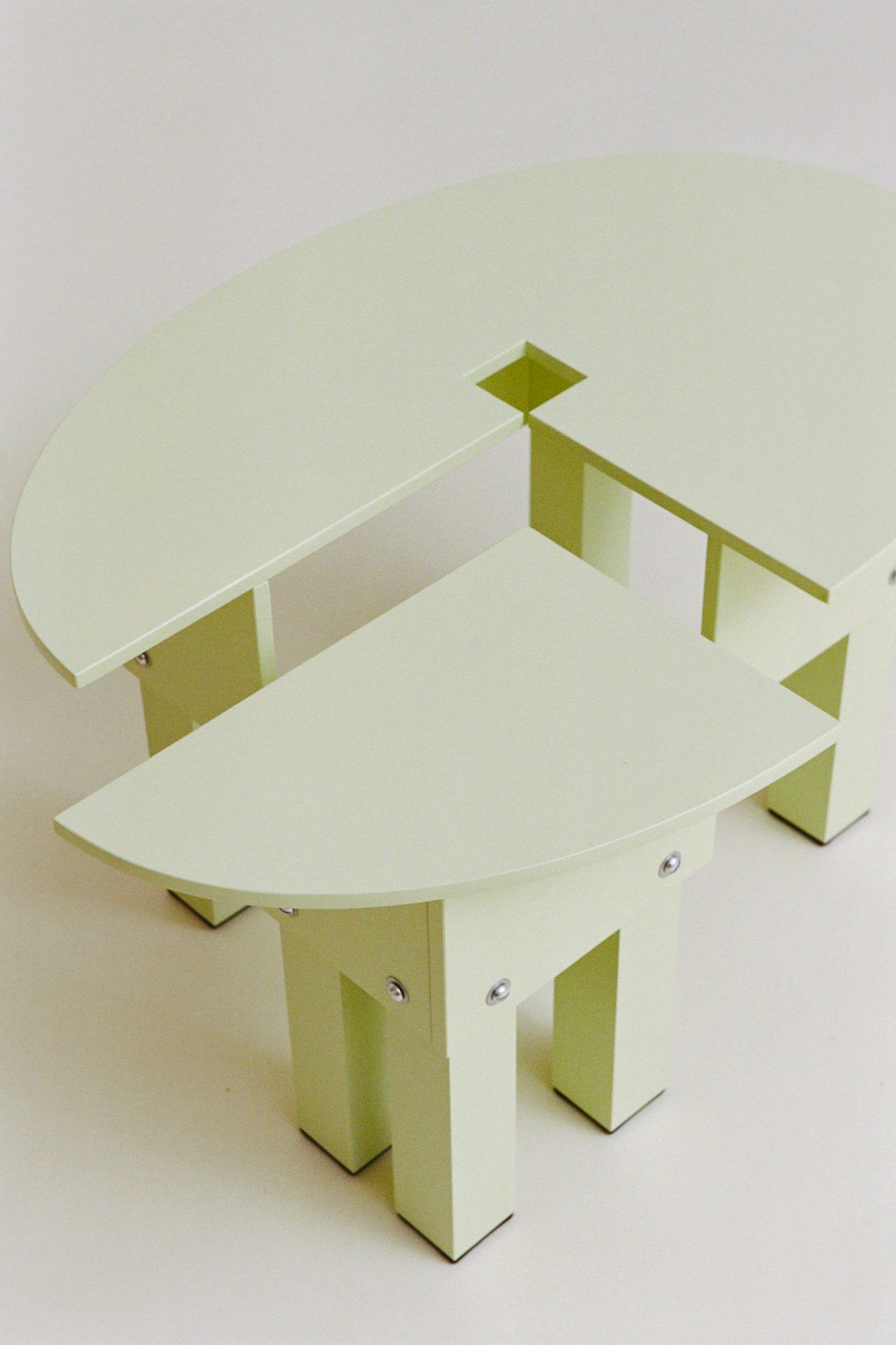 Constructed from thin plywood panels and hollow aluminum legs, the tables are unified by a rich, tactile painted finish with a fetish-like attention to joinery and hardware. Each table is distinct, yet designed to combine into a connected composite pattern. A graphic cut “drawing” runs through the tabletops, generating a continuous pattern across the ensemble. Practical decisions made during fabrication such as square cutouts used to pivot the material while cutting determine the formal details of the work.