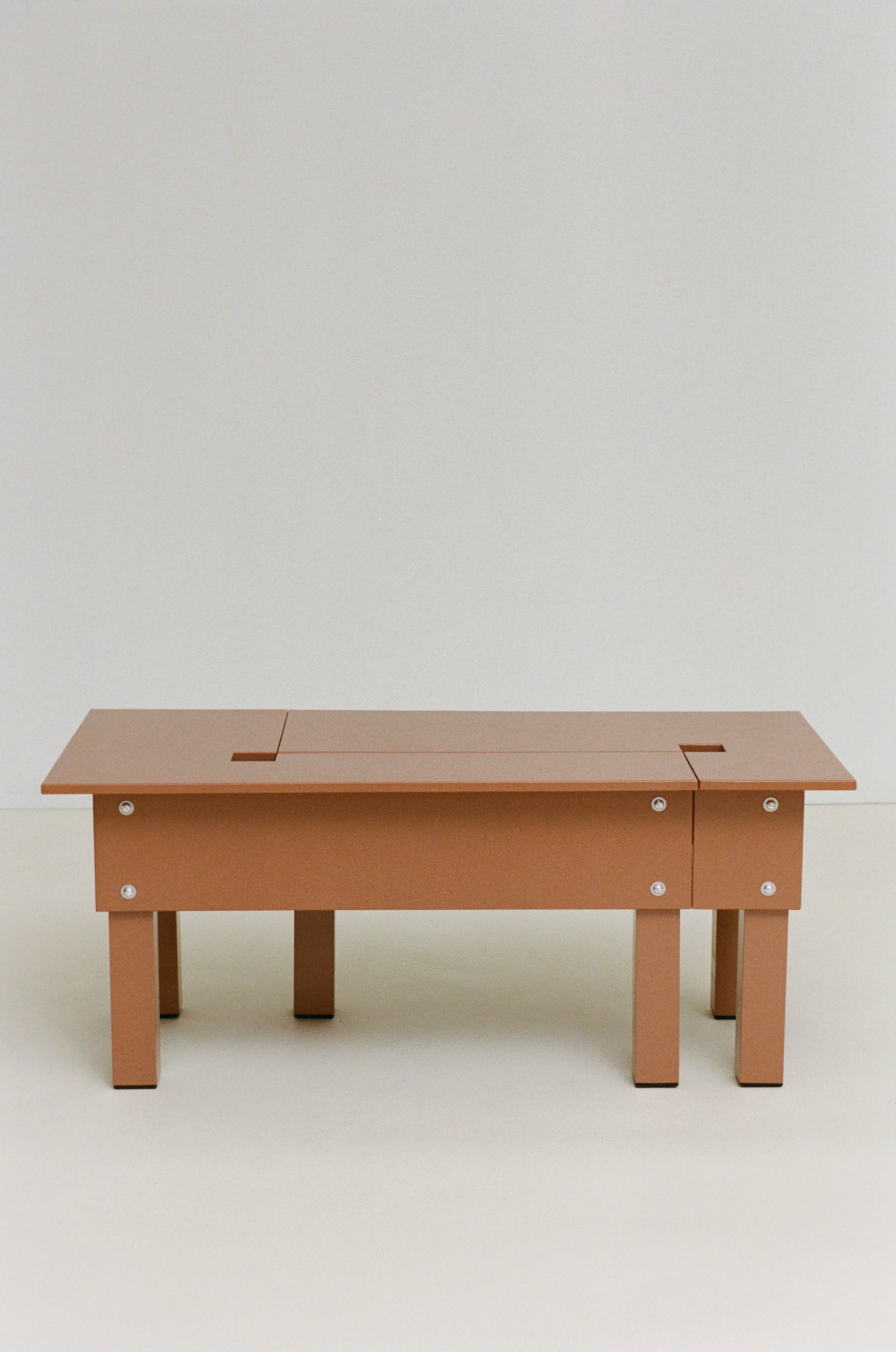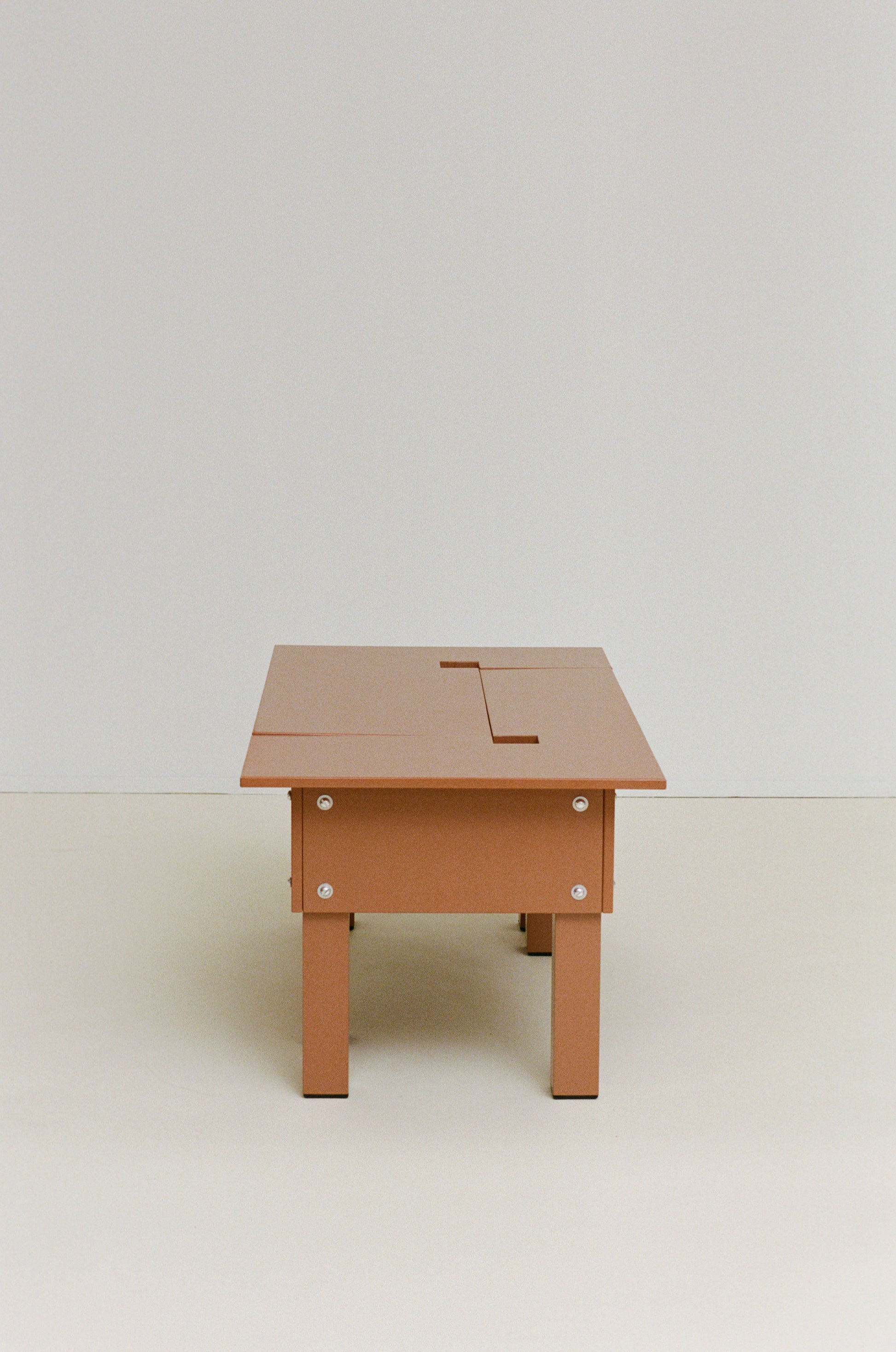 Constructed from thin plywood panels and hollow aluminum legs, the tables are unified by a rich, tactile painted finish with a fetish-like attention to joinery and hardware. Each table is distinct, yet designed to combine into a connected composite pattern. A graphic cut “drawing” runs through the tabletops, generating a continuous pattern across the ensemble. Practical decisions made during fabrication such as square cutouts used to pivot the material while cutting determine the formal details of the work.