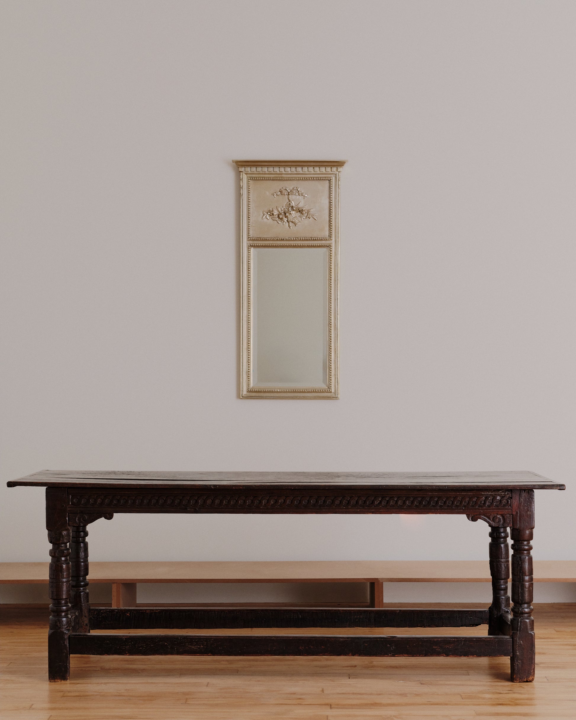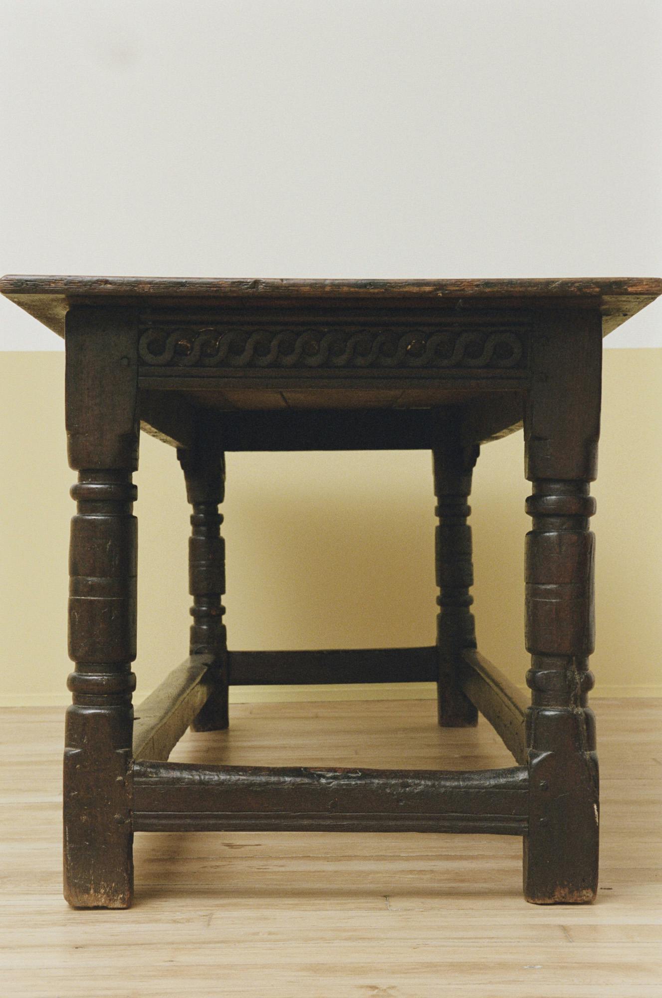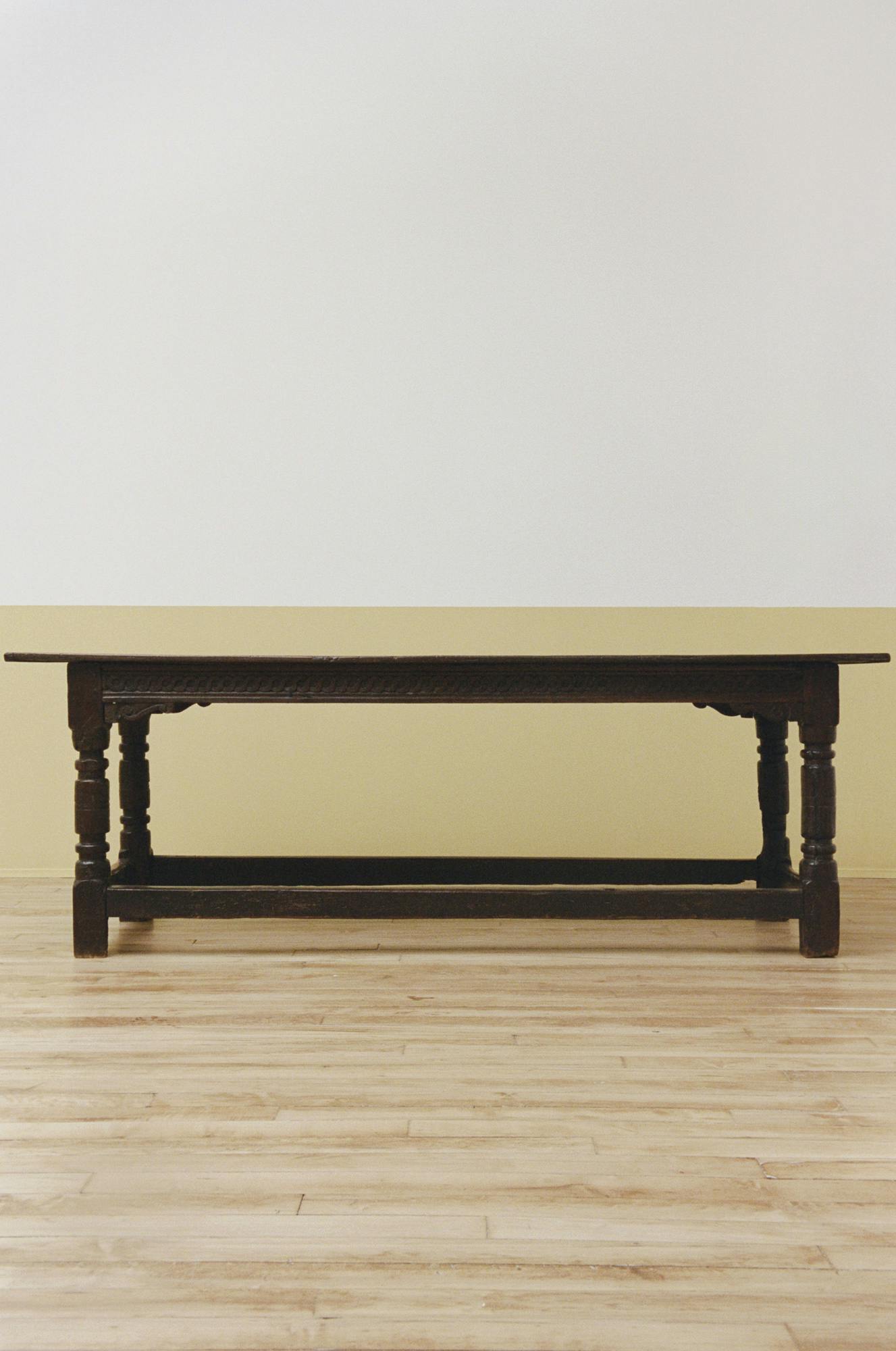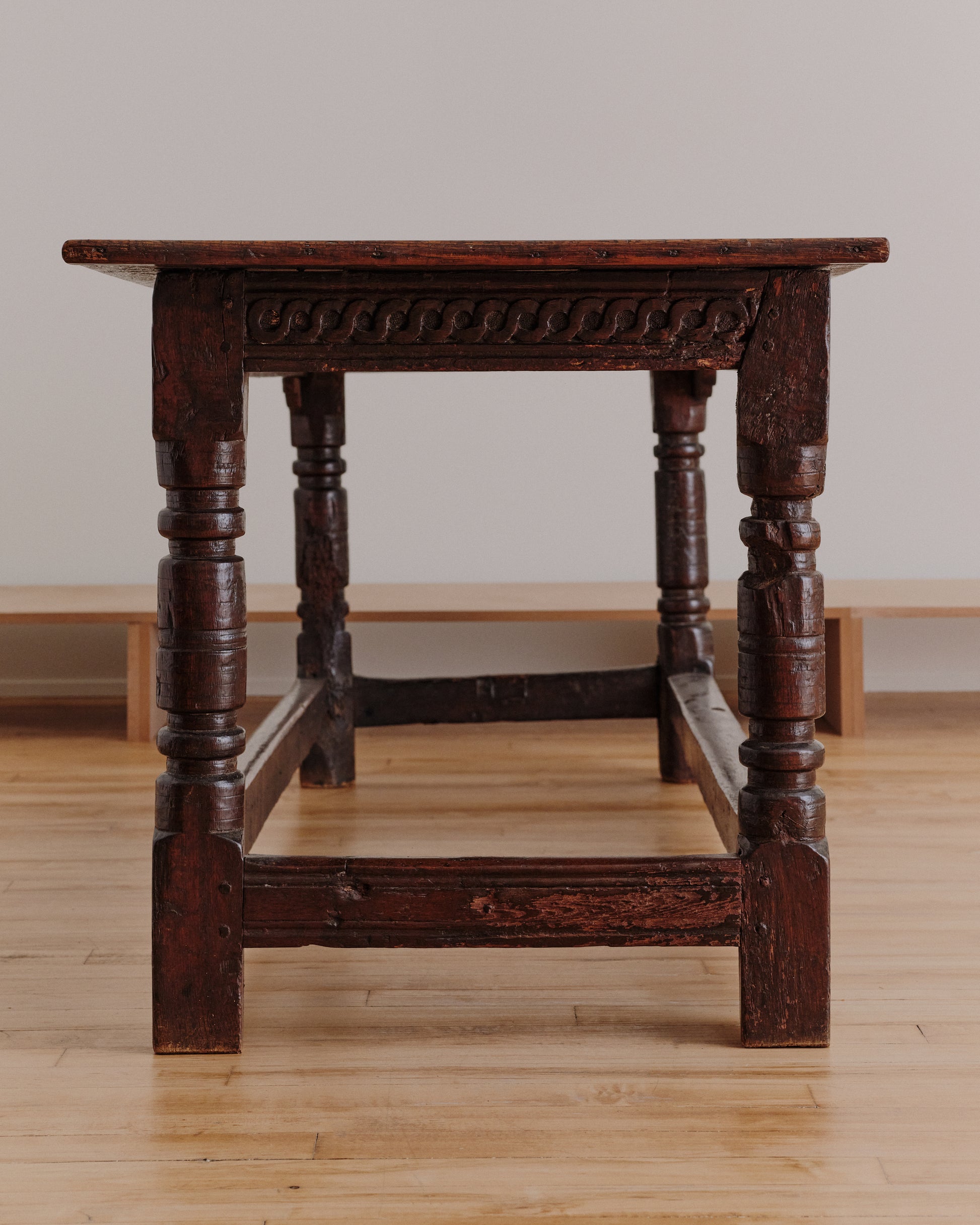 Made in the 17th century, this English refectory table was most likely used in an ecclesiastical interior. The deep oak surface is in wonderful condition for its age, and its rich hue exhibits a beautiful, gentle patina. The apron is hand carved with geometric patterning, in wave-like and elliptical forms. The turned baluster legs are joined by two low trestles for stability.
