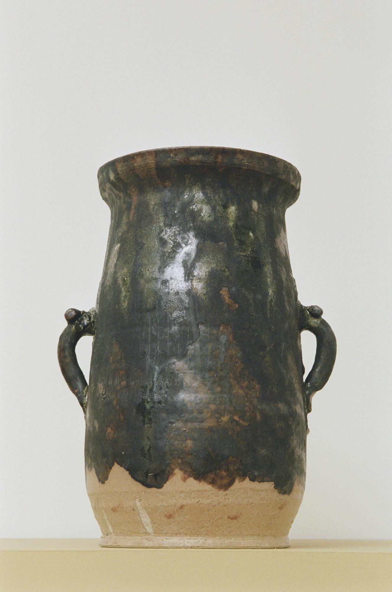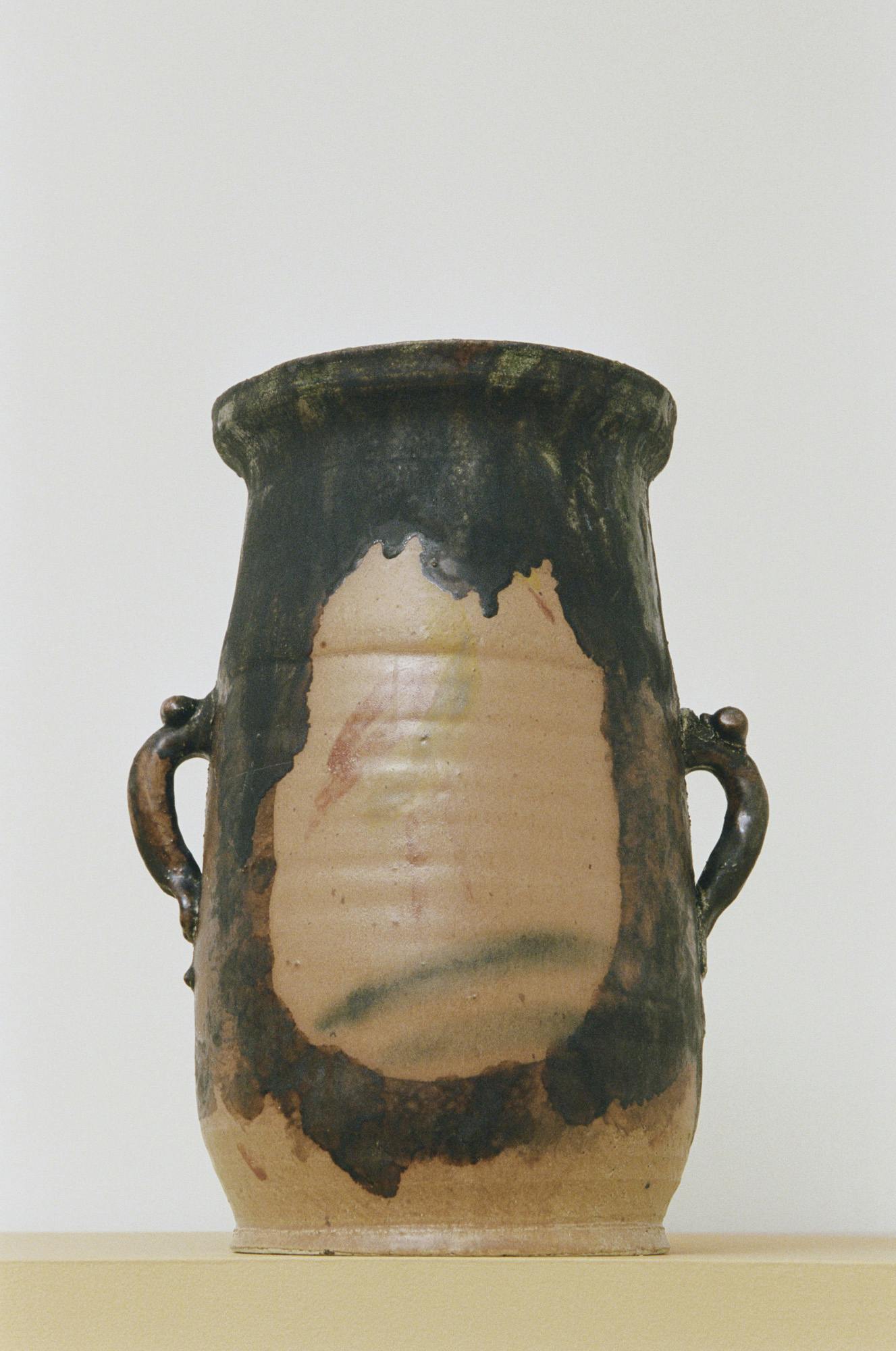Inspired by medieval English and French pottery, Jordan McDonald’s large Fraktur series explores the churlishness of ceramic material, and the inherent “push and pull” in the vessels’ construction. With an onyx toned slip that appears to drip down the surface, there are faint traces of delicate sgraffito. The vessels appear almost pre-historic, and depict organic figurative forms and decorative patterning. A pair of rounded handles and pronounced curved lip reference traditional pottery forms.