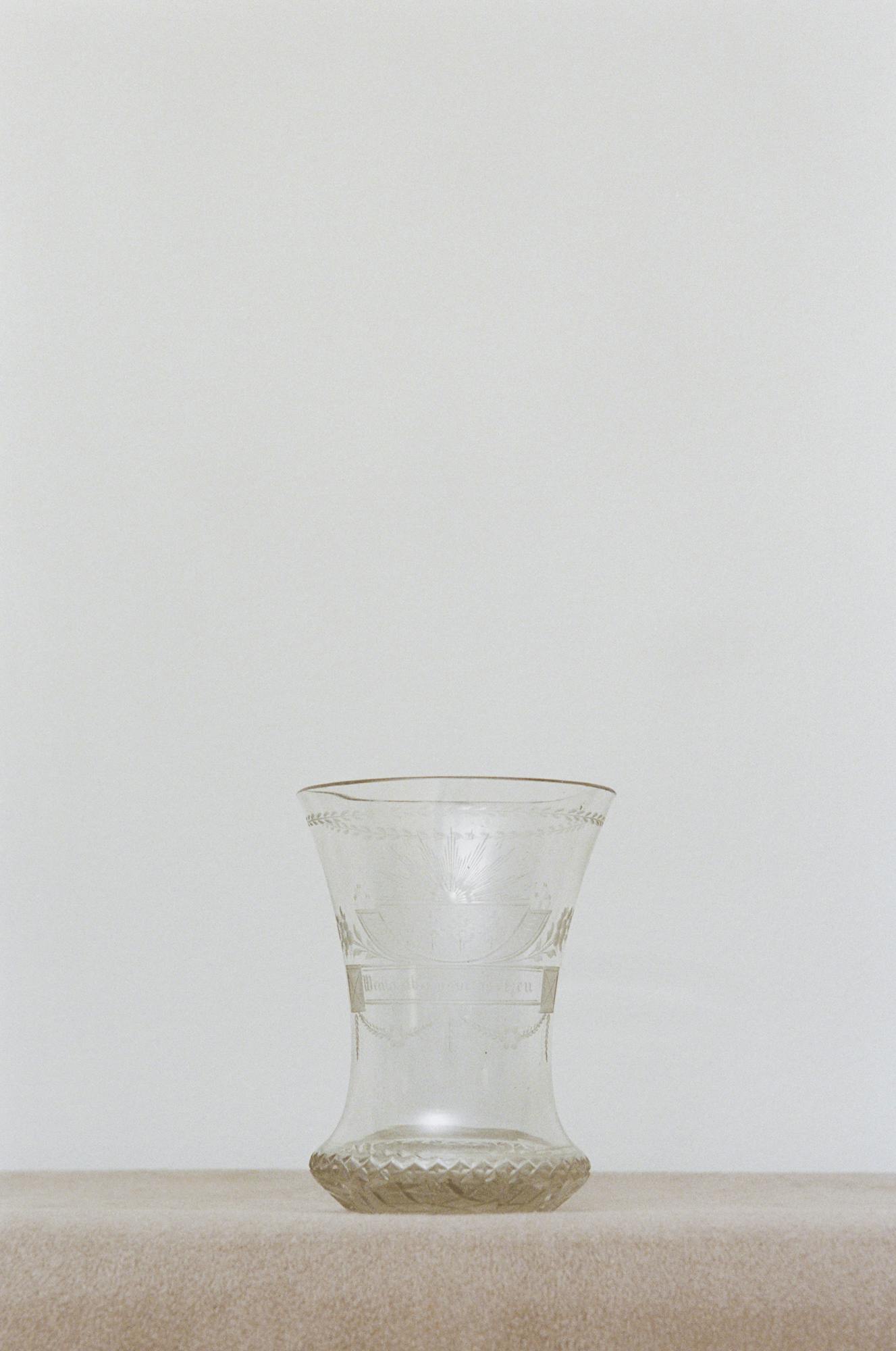 The Biedermeier style became fashionable in Central Europe during the first half of the 19th century. Due to the advancements of industrialization and a burgeoning middle class, domestic spaces were furnished upon notions of sensibility, humility and temperance. During this period, “Biedermeier Glass” was very popular, achieved through new glassmaking techniques, including chemical treatments and industrial wheel-engraving. This charming, delicate, colorless vessel was produced in Germany in 1830, and is engraved with “little, but from the heart”, written in script. Floral motifs wrap around the glass with garlands and felicitations, a worthy offering to friendship.