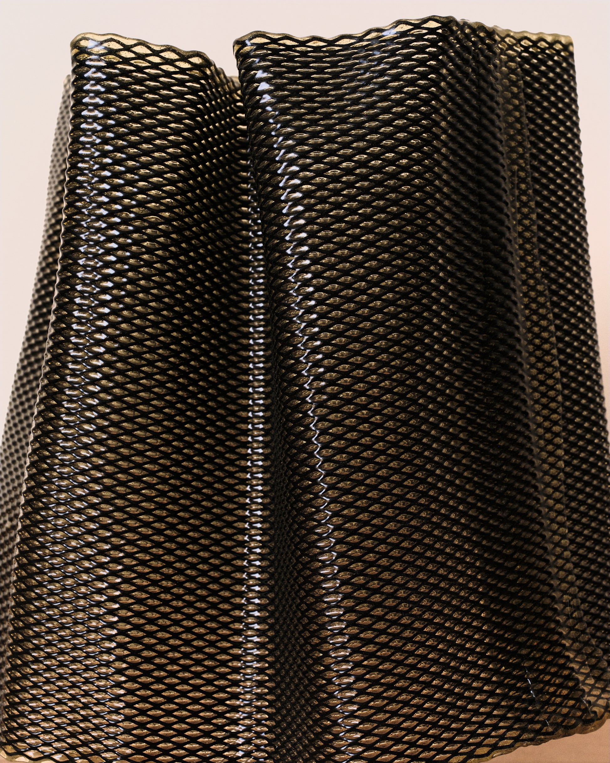 In his new lamp series, Joel Muggleton of LS GOMMA continues his exploration of rubber and metal mesh. Layers of pigment and varying mesh gauges diffuse light to create a rich surface and depth. Simple box-shaped forms are suspended onto large stainless steel needles, which are fabricated to different lengths for varying heights. These needles pierce into the structures rather than simply upholding them, transforming their support into a sculptural gesture. In this way, LS GOMMA loosens the logic behind functional design, resulting in a more expansive and spirited expression of material, light and form.