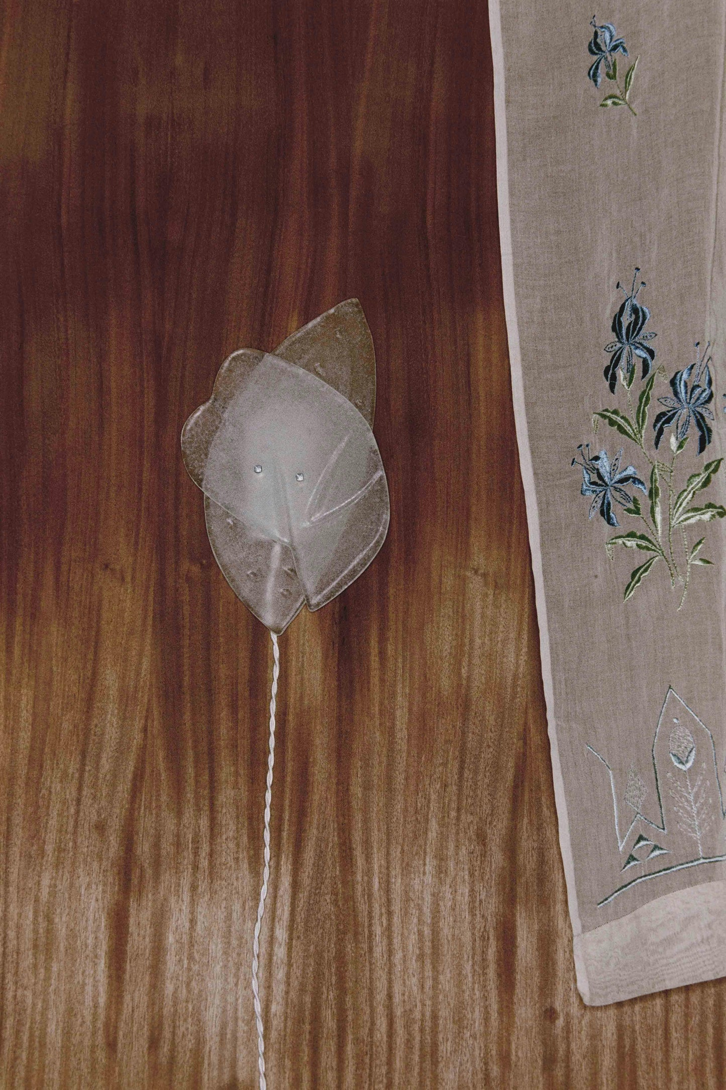 Weinberger’s background in historic preservation is present in her informedness of age-old techniques such as pâte de verre. The results of this cumbersome process are unique, elegant panels of translucent glass, which have been fastened with custom hardware into wall sconces. The lights are abstract and sculptural, vaguely evoking flowers with translucent petals, a nod to the Art Nouveau period when a revival of pâte de verre flourished. This sconce consists of two leaf-like plates, thick and smooth, overlapping to give various levels of translucency. The unusual material quality of the textured matte glass creates a perfectly warm light when switched on.