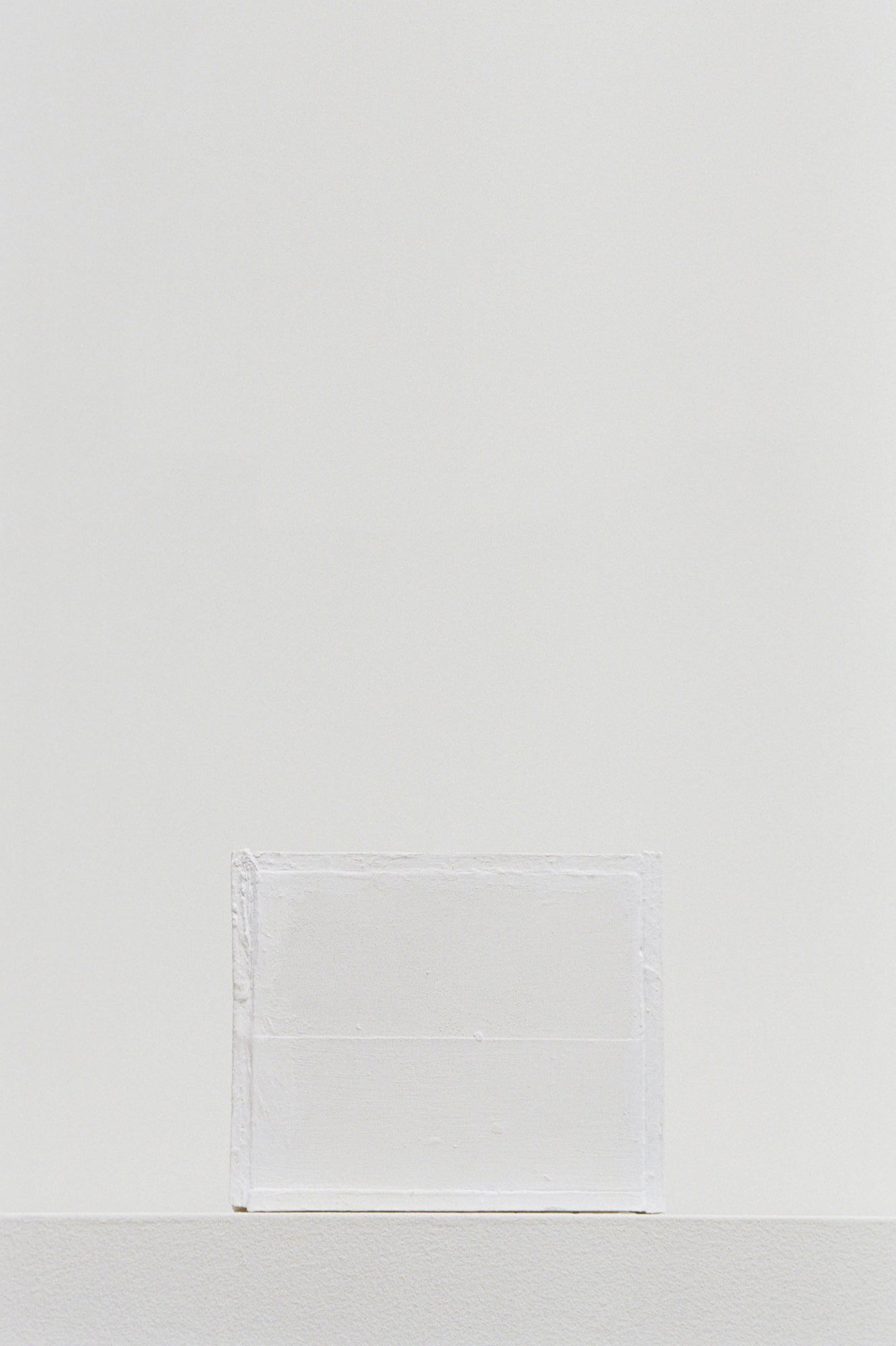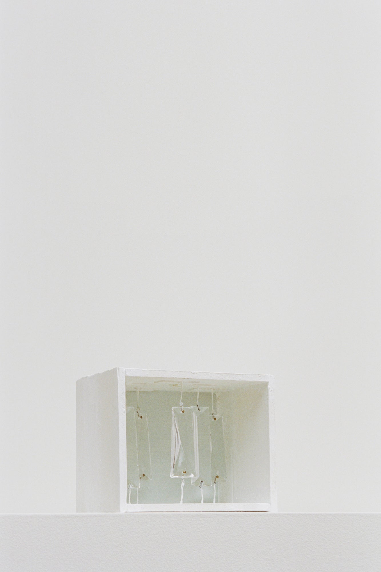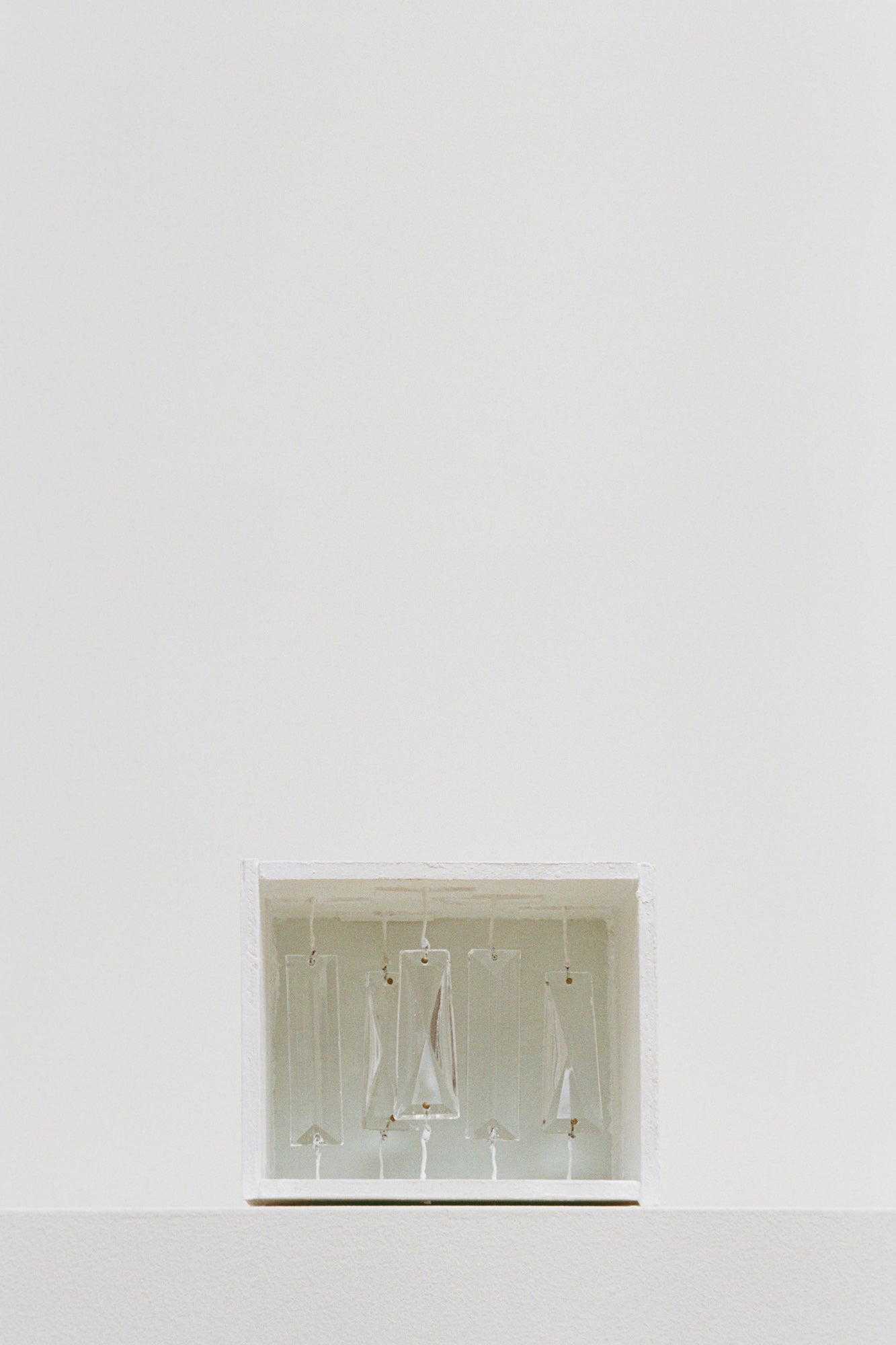 For “Play!”, artist Elliot Camarra’s works unfold around a loose narrative of a vessel far out at sea, where the horizon dissolves into a disorienting abstraction of water and sky. Subtle natural phenomena become harbingers of change, movement, and hope, guiding the imagined sailor through an otherwise endless landscape. This narrative is further articulated through sculptural forms that allude to the tradition of storytelling through stage scenery maquettes. I Go Vaguely I and II function as dioramas depicting abstracted oceanscape scenes, each contained within a painted wooden enclosure. Inside, antique glass elements, suspended and fastened with metal, fracture light and space. This produces ever-shifting reflections that create a sense of disorientation and confusion.