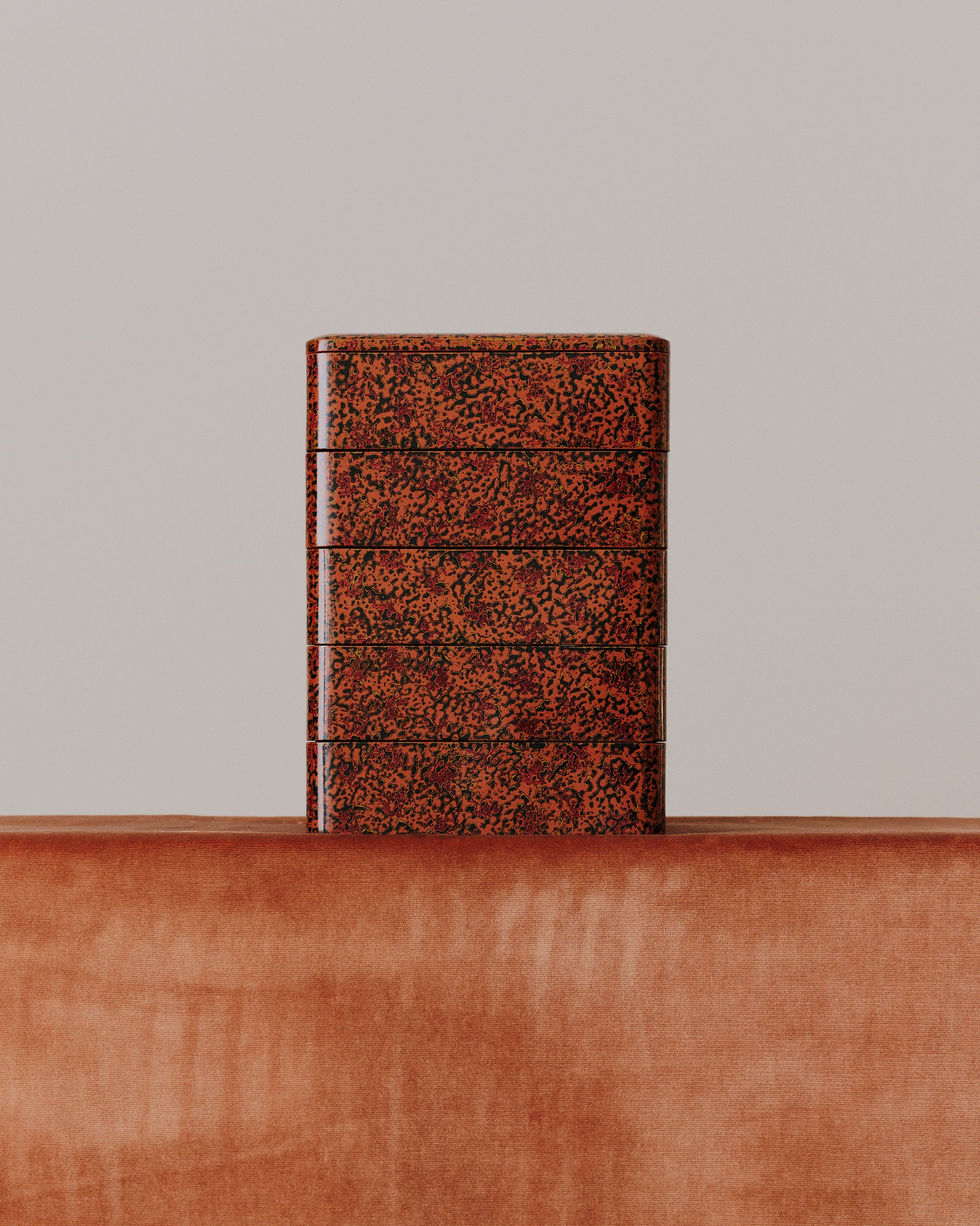 Bento boxes, or shokado-bento, have existed as a part of Japanese culture for centuries, originally used to pack meals for travel. Traditional lacquerware, known as urushi, is made from the sap of the lacquer tree, a process that has been refined for over a thousand years. This set of mid-20th century Japanese stacking bento boxes is made of smooth, soft wood. The exterior is finished with an orange lacquer finished with a speckled pattern, and its interior exhibits the same lacquer in a rich tomato-red hue. These mid-20th century bento boxes include two tops, allowing for a diverse range of combinations of use.