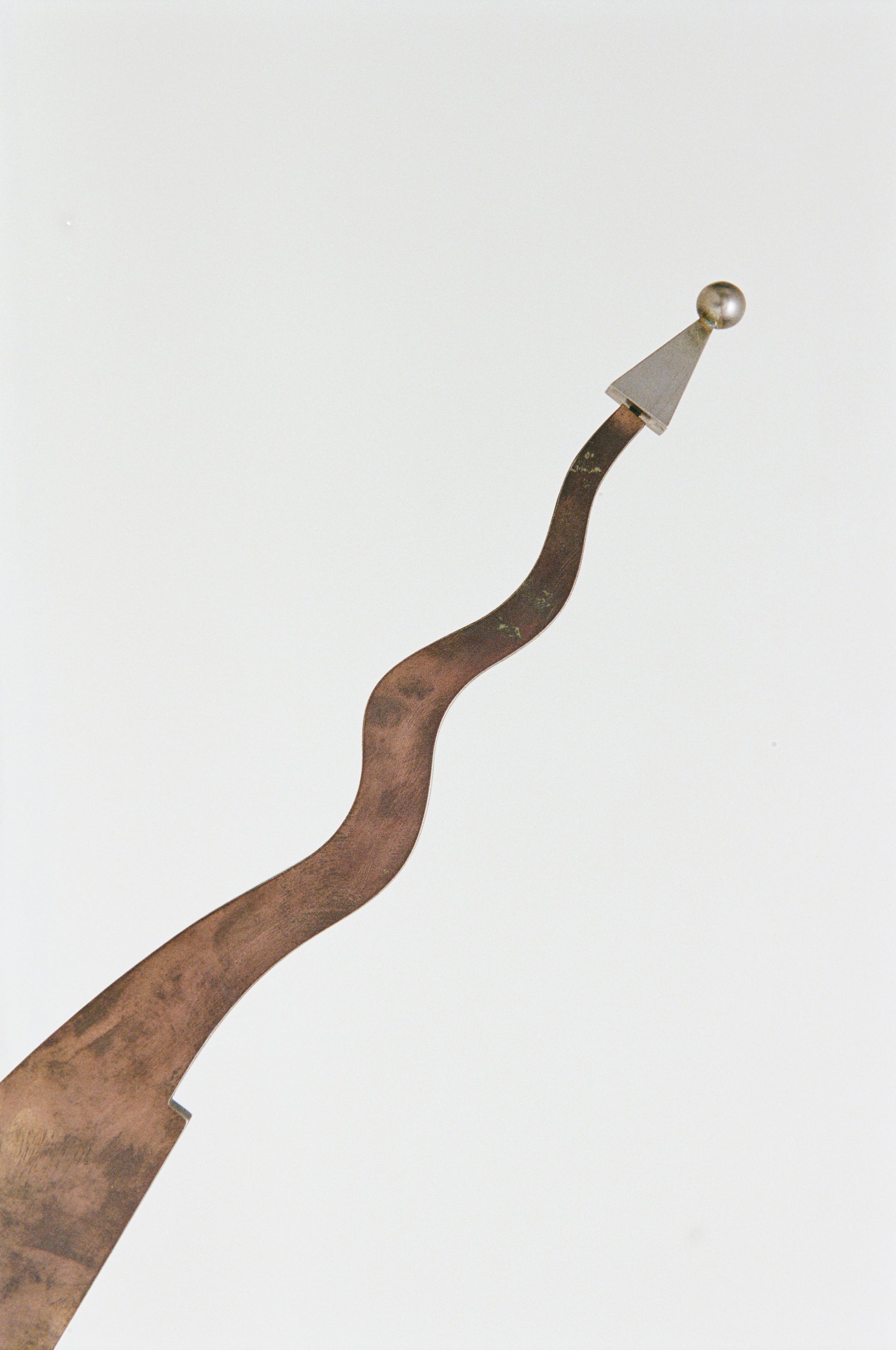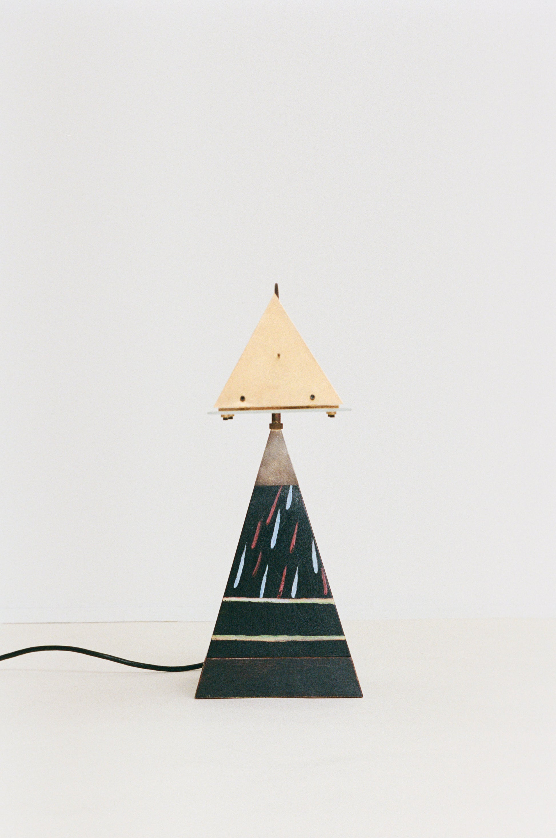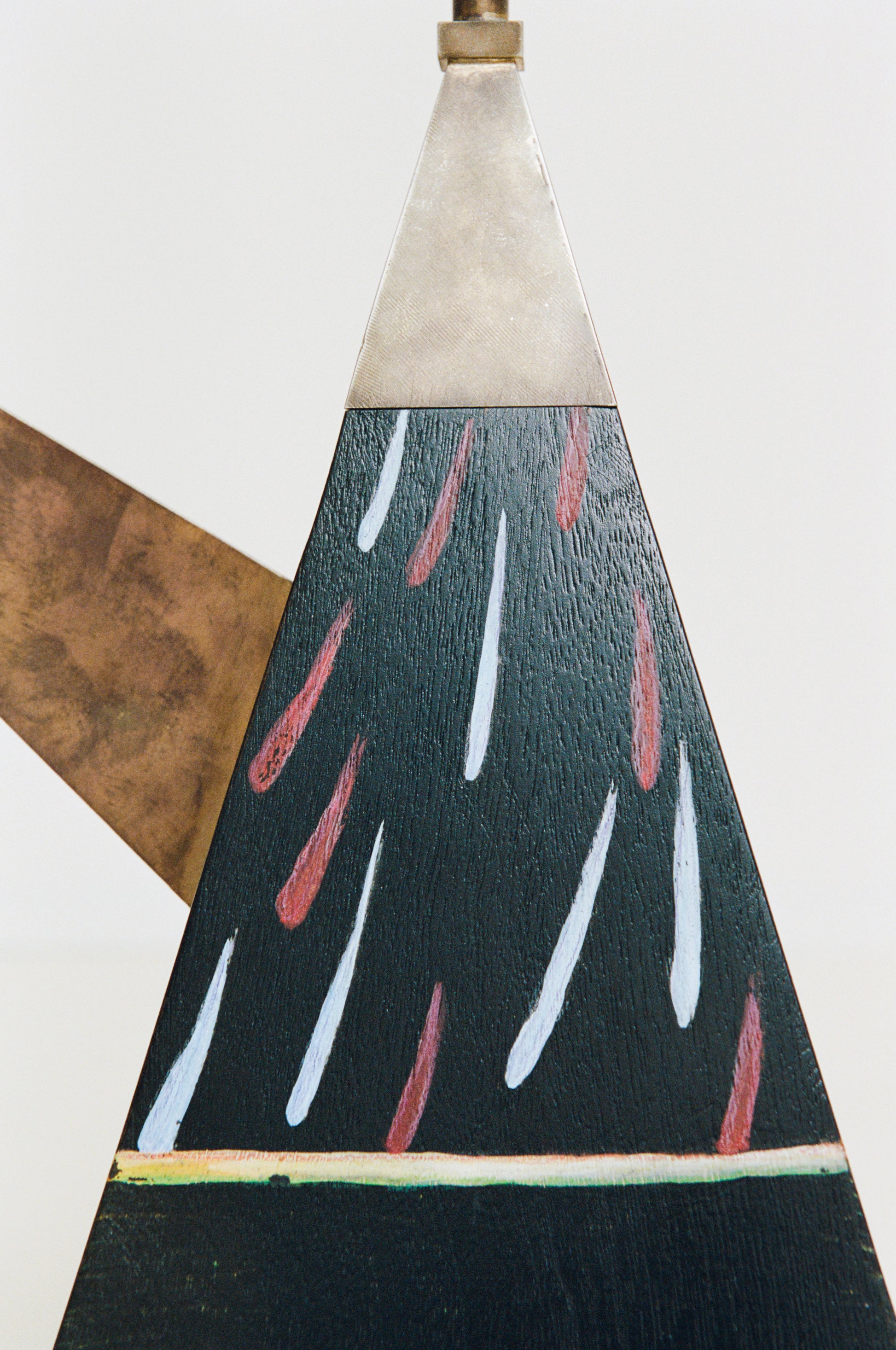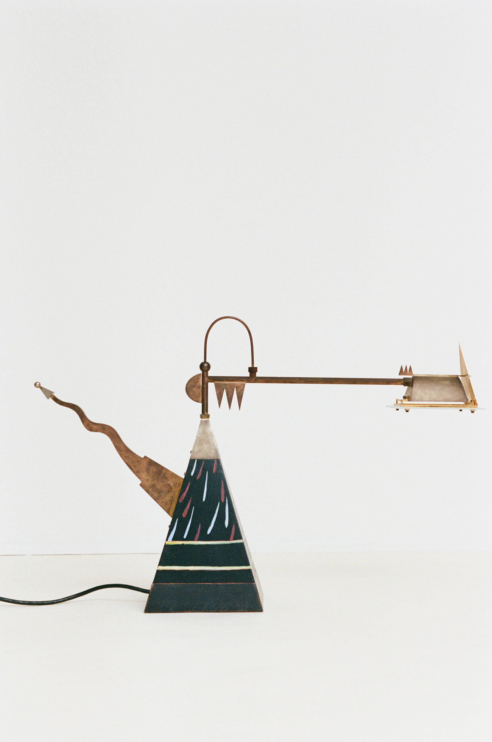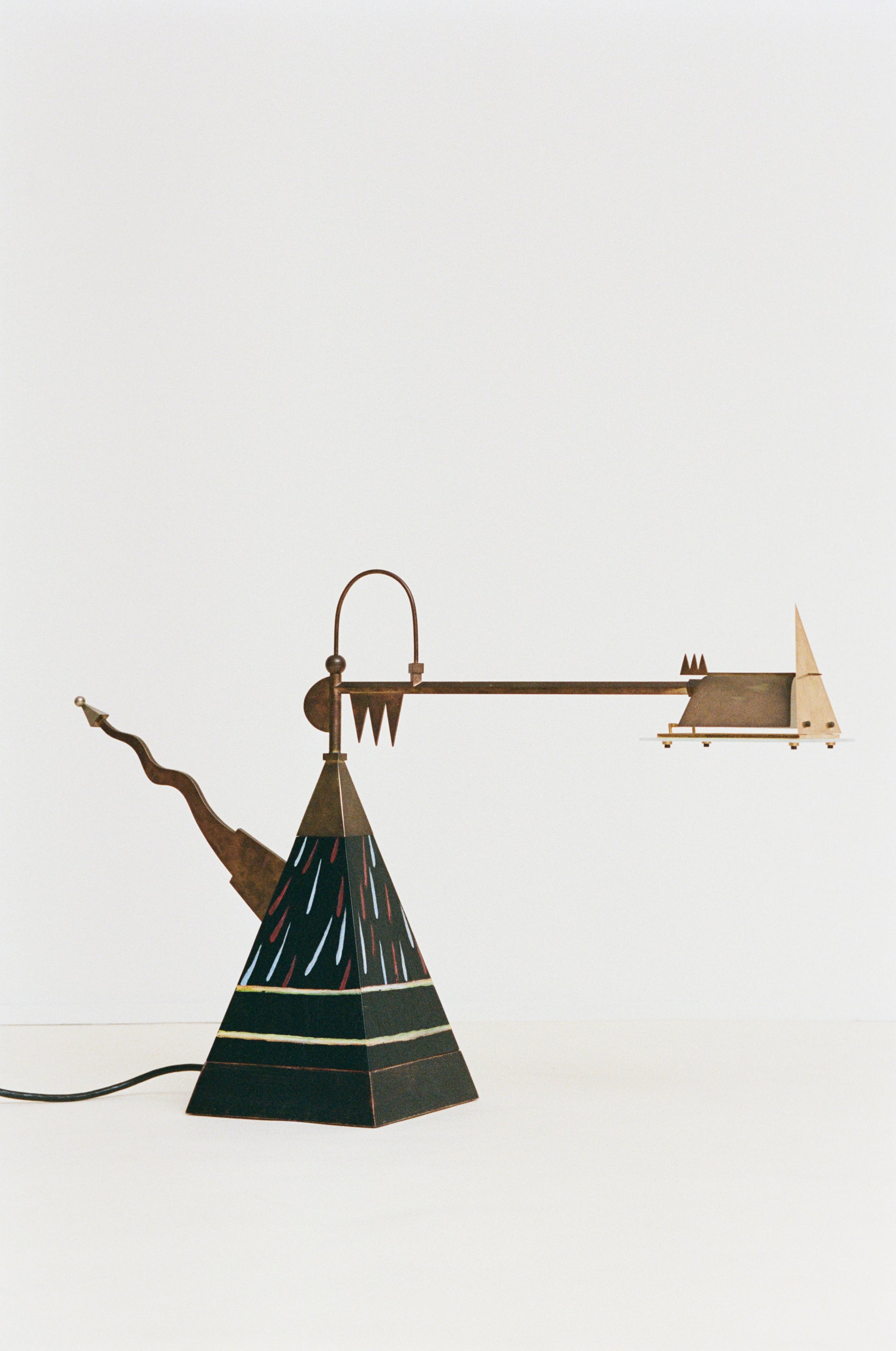 Gary Knox Bennett was an influential Bay Area American artist, furniture maker and metalsmith, well regarded within the American Studio Craft Movement that emerged in the mid-20th century. This kinetic table lamp dates to 1977 – an early period in Bennett’s exploration of lighting – and demonstrates a direct formal and conceptual relationship to his jewelry practice, which includes his well-known roach clips of the 1970s. The lamp's pyramidal wooden base is hand painted, and the adjustable brass armature and clasping mechanisms allow for dynamic and flexible use. Infused with a sense of humor and experimentation, the lamp turns on and off by toggling the brass “tail”.