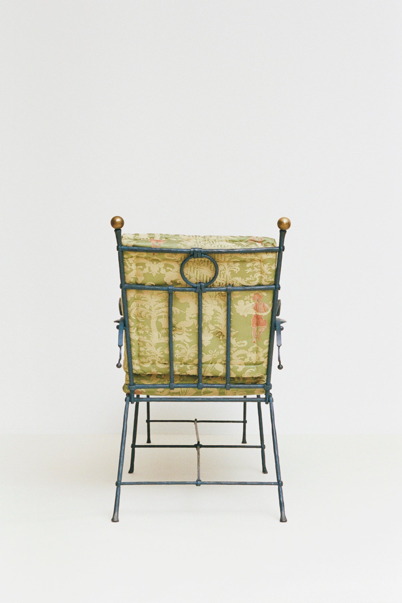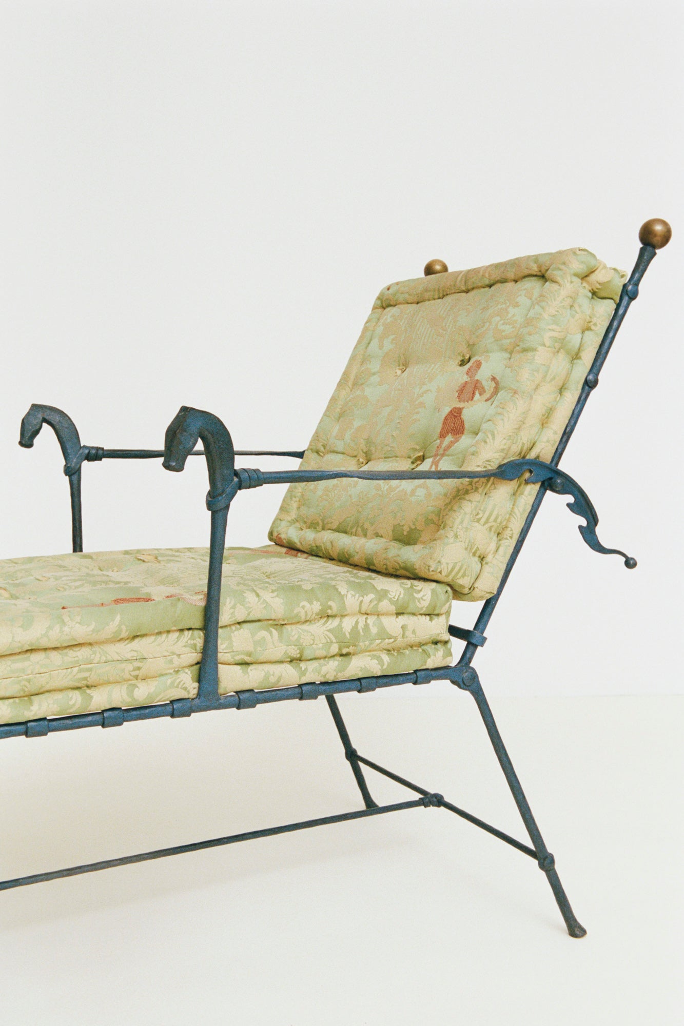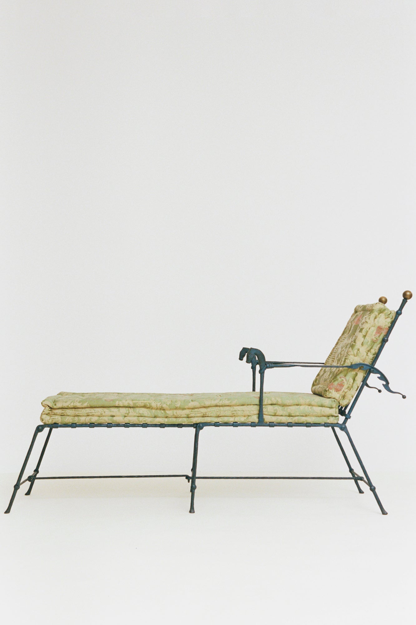 Trained in metalworking, German designer Stefan Herzog is known for producing limited-edition furniture that demonstrates thoughtful craftsmanship and expressive ornamentation. Made in 1989, this lounger is composed of a cast metal and wrought iron frame, articulated through slender linear and curling details that evoke historical ironwork. The arm rests are shaped like fantastical horses, while the adjustment mechanism takes the form of their tails, electric like lightning. Brass finials punctuate the structure, and the lounger is softened by exquisite upholstered lime-green box cushions in original brocade fabric. Though intended as a chaise lounge, the lounger can also be transformed into a simple armchair by removing one portion.Â
