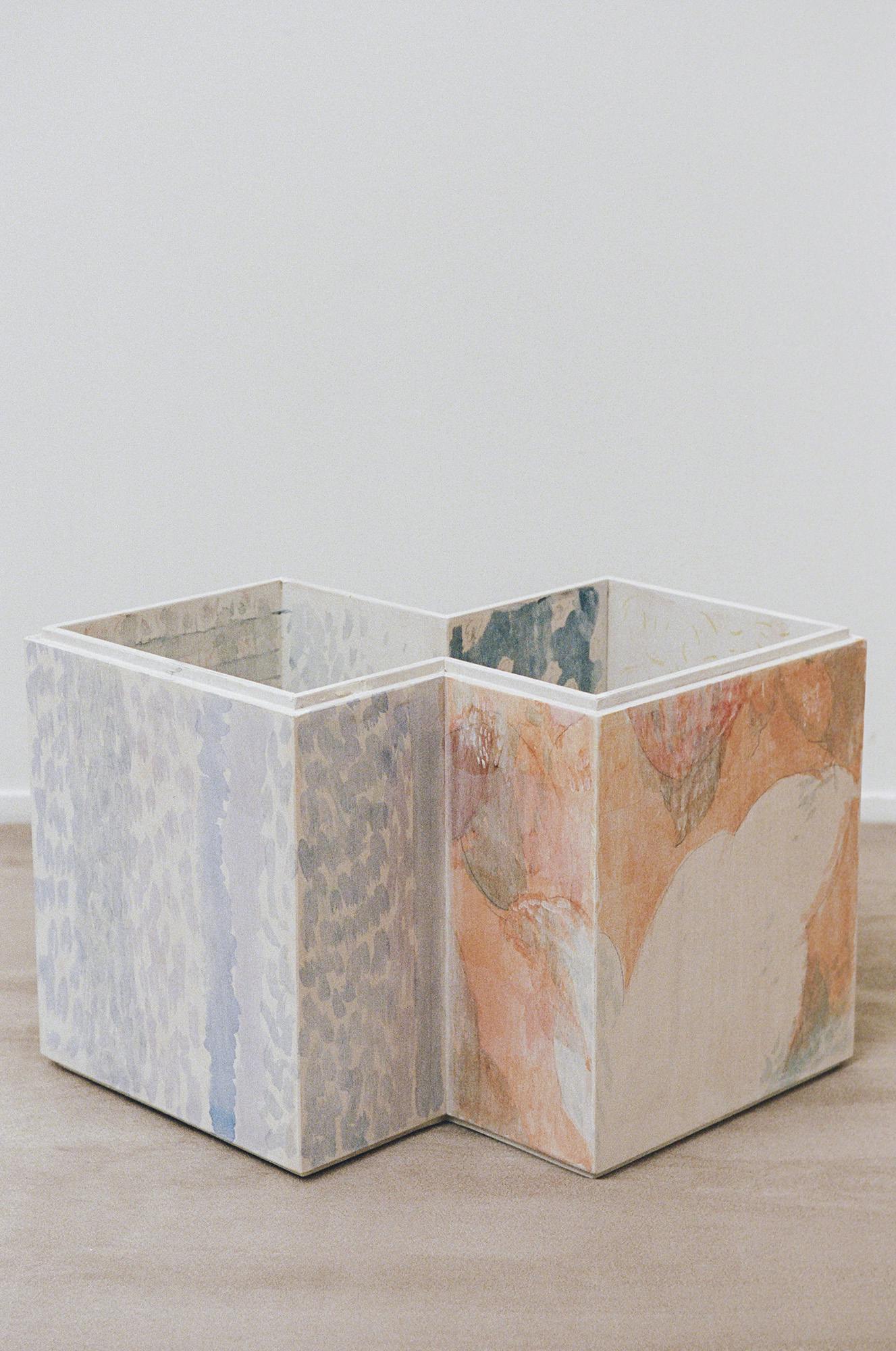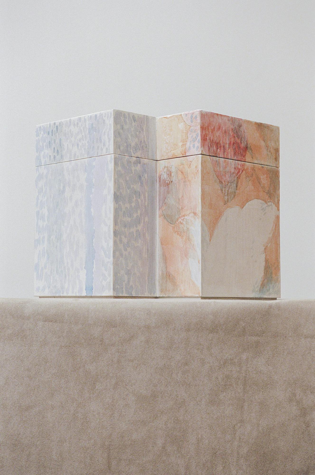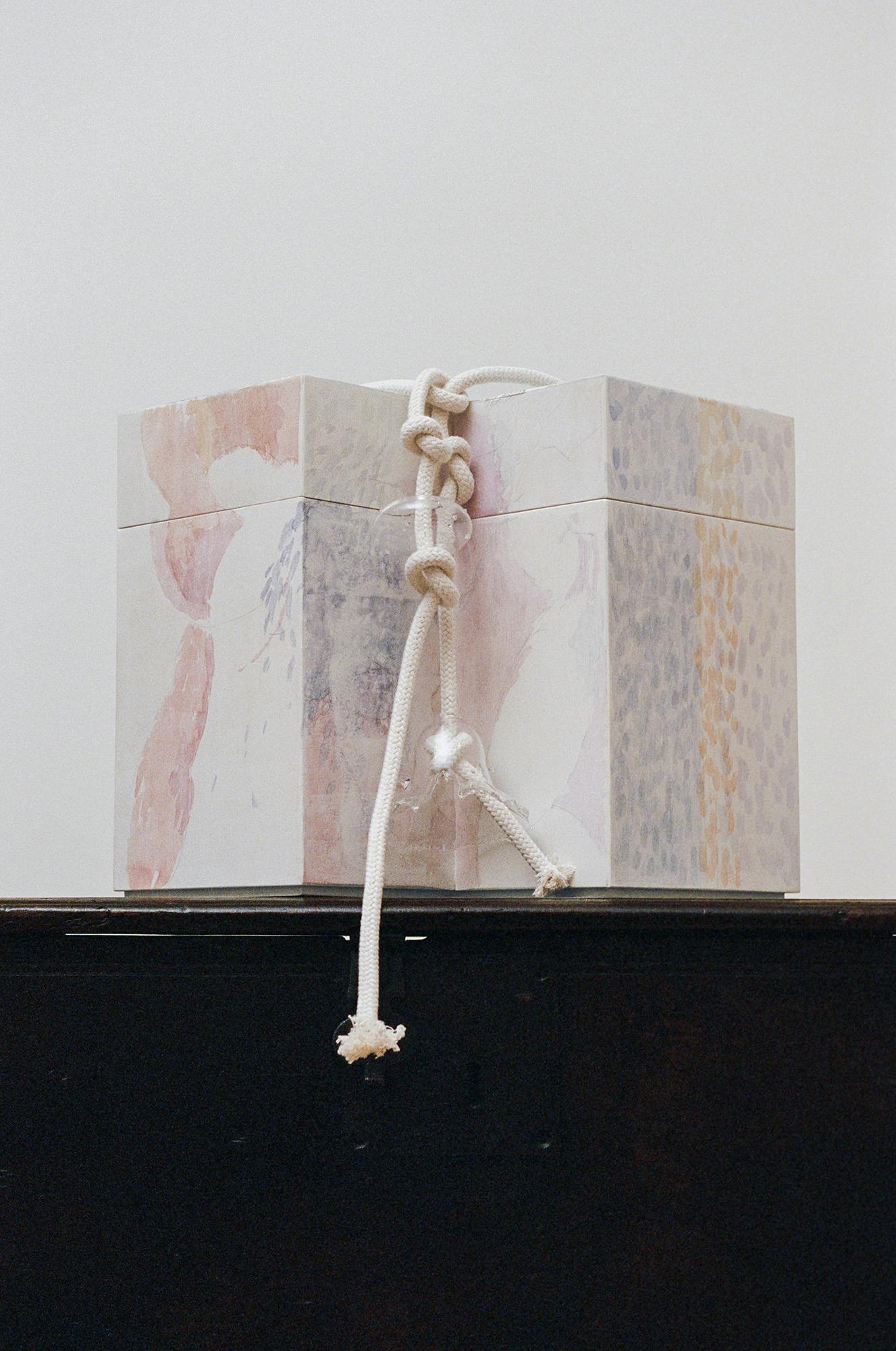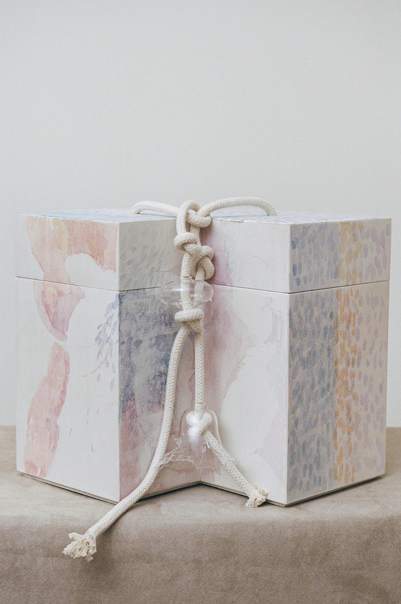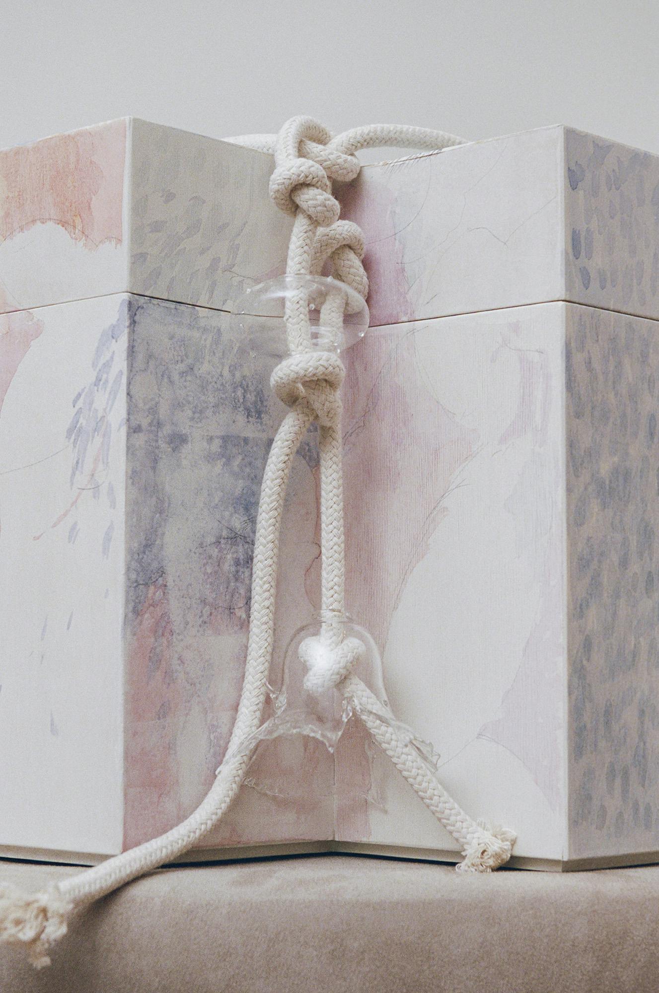 Materials: Birch plywood box, water based paint, linen and cotton rope, borosilicate and enamelled copper charms