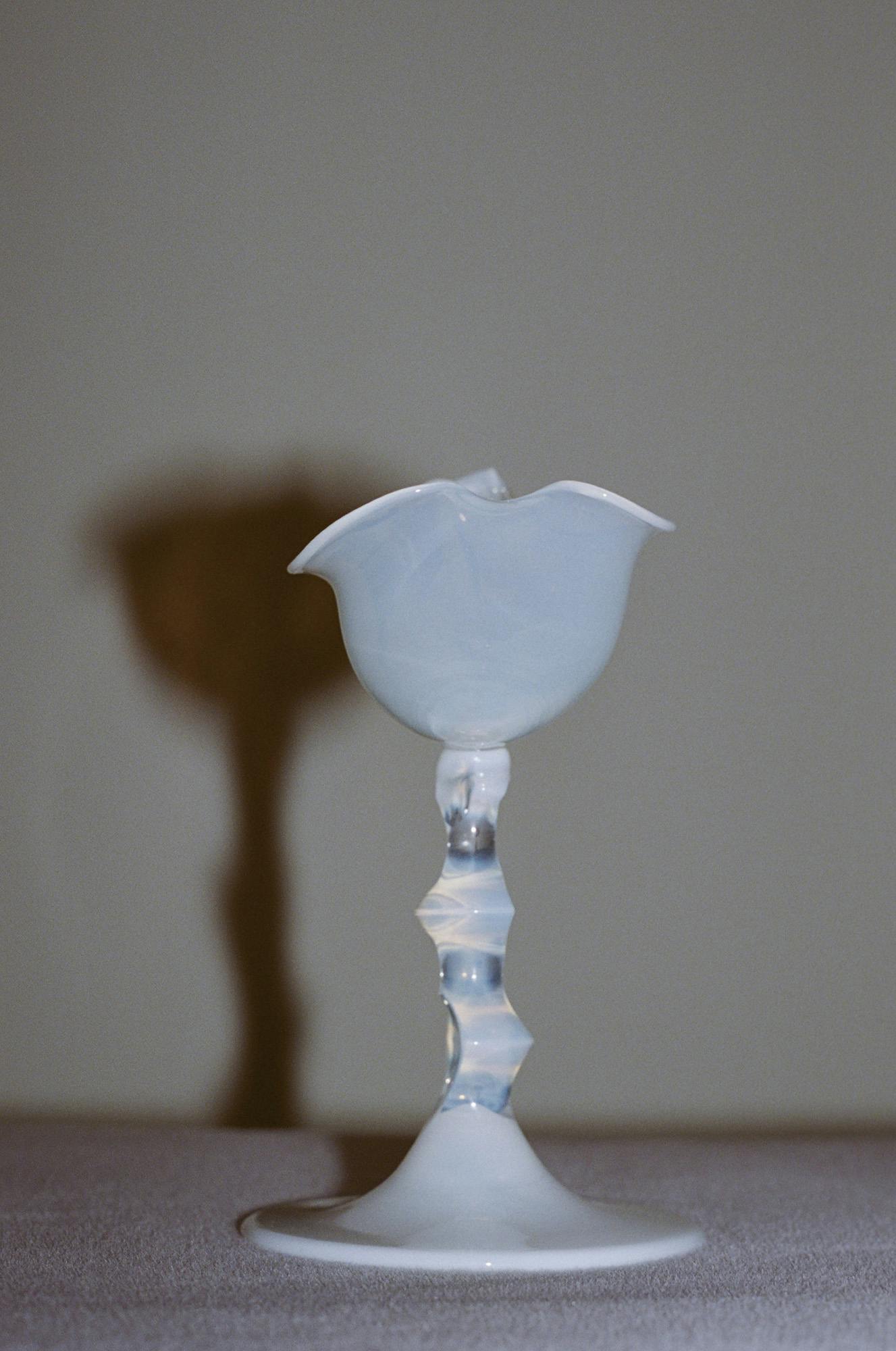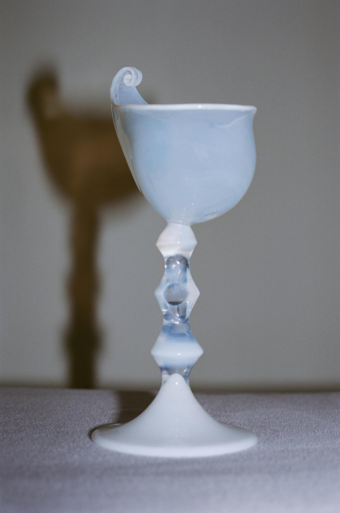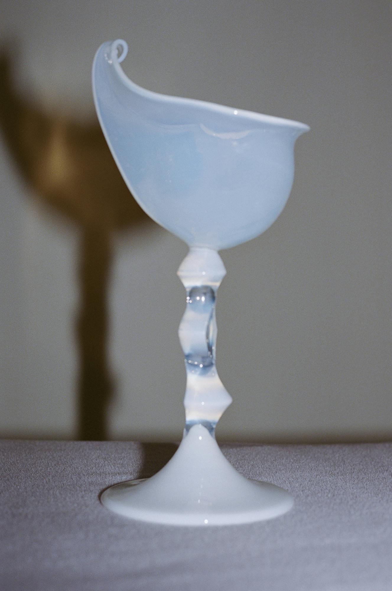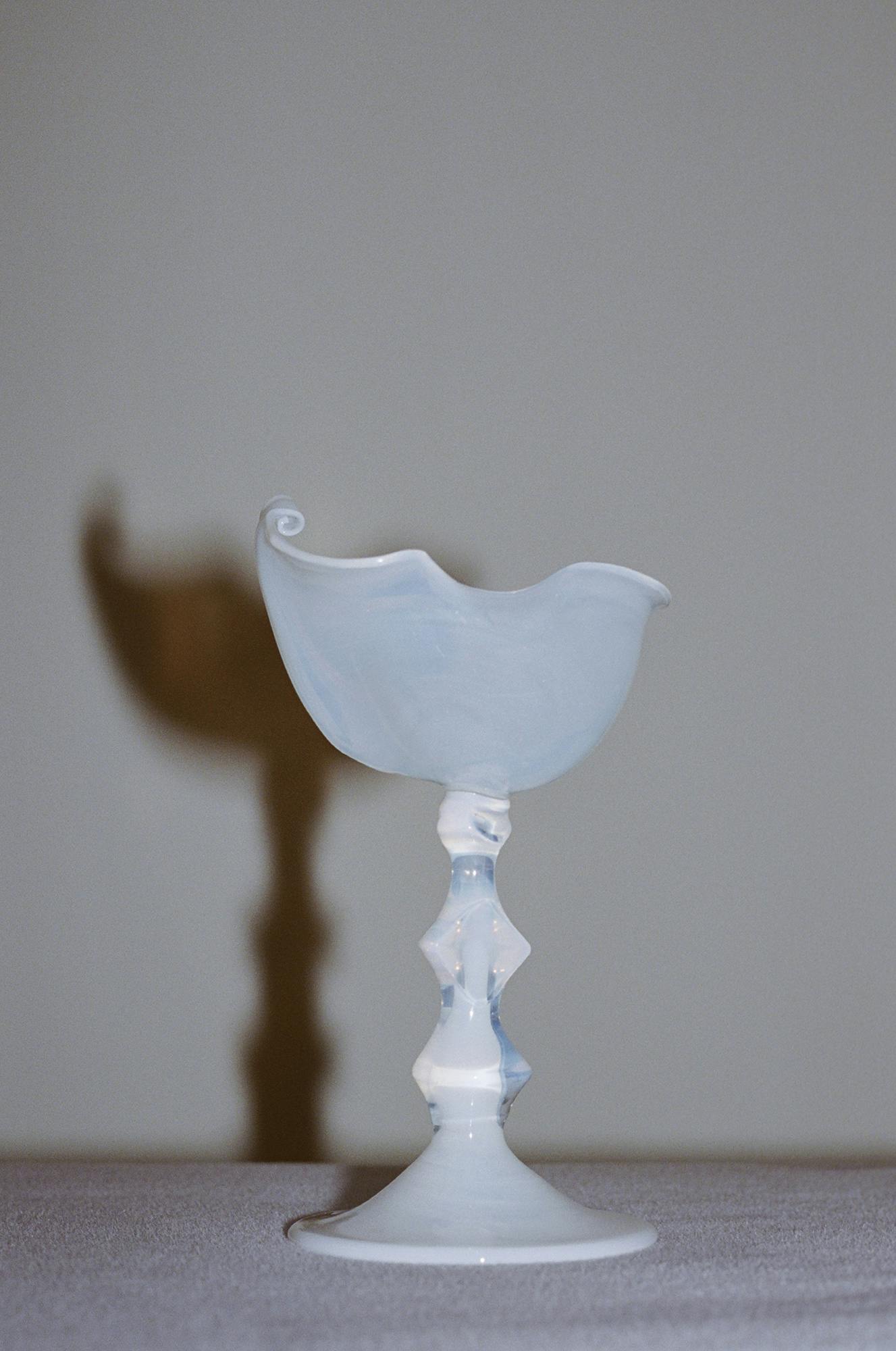 Exploring ideas of organic decay and mutations in nature, Cameranesi Sgroi allows the glass to breathe, imbuing it with a life of its own. The result is an unexpected and almost uncanny expression of the material, corporeal in nature. The artist’s preoccupation with objects particularly suited for a celebratory occasion – a banquet, an intimate nightly ritual – retain a sense of sensuality and glamor, while simultaneously inviting a sense of bodily transformation, decay and even illness – sumptuous like pearls but also rigid like ice or bone.