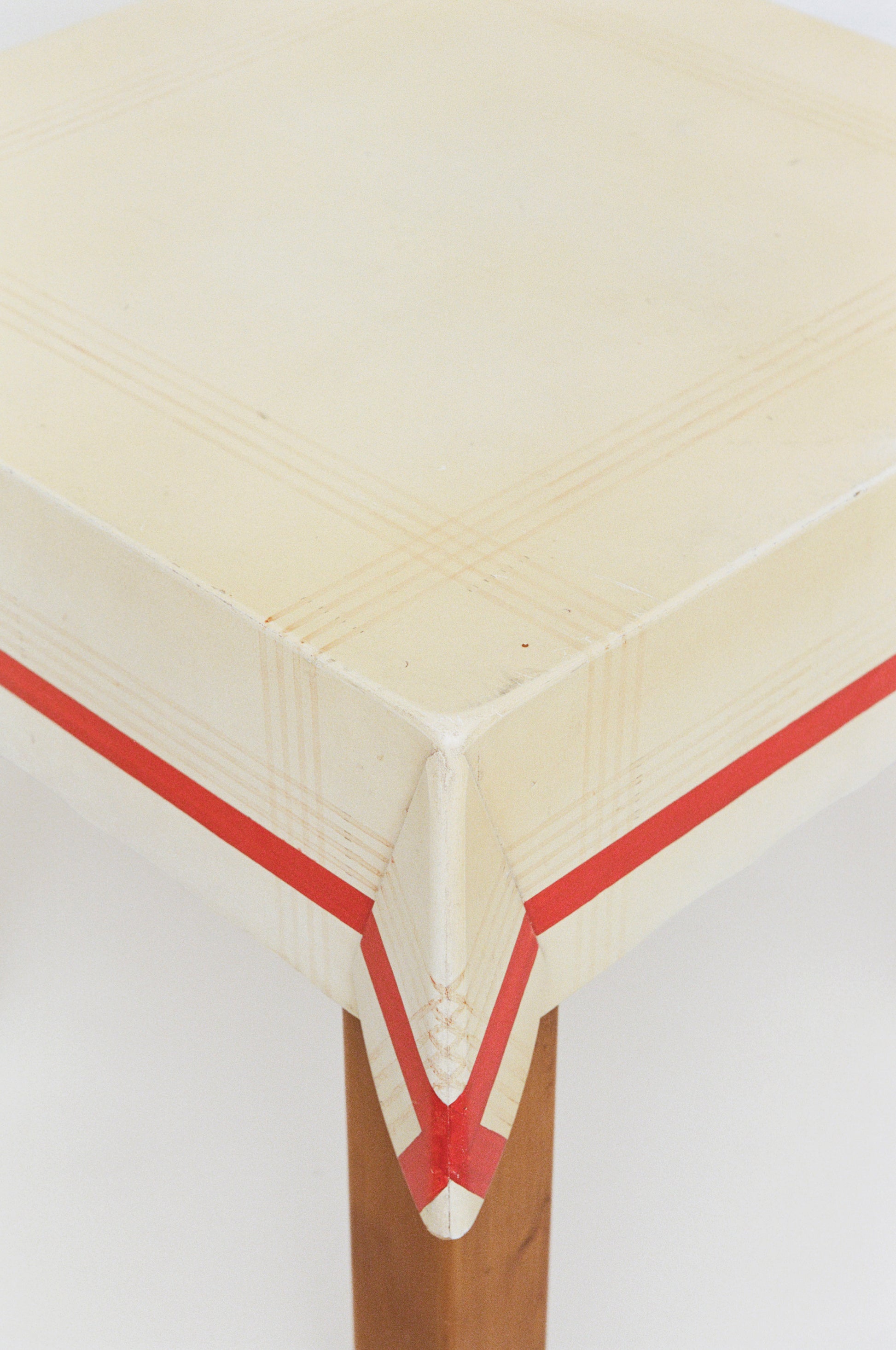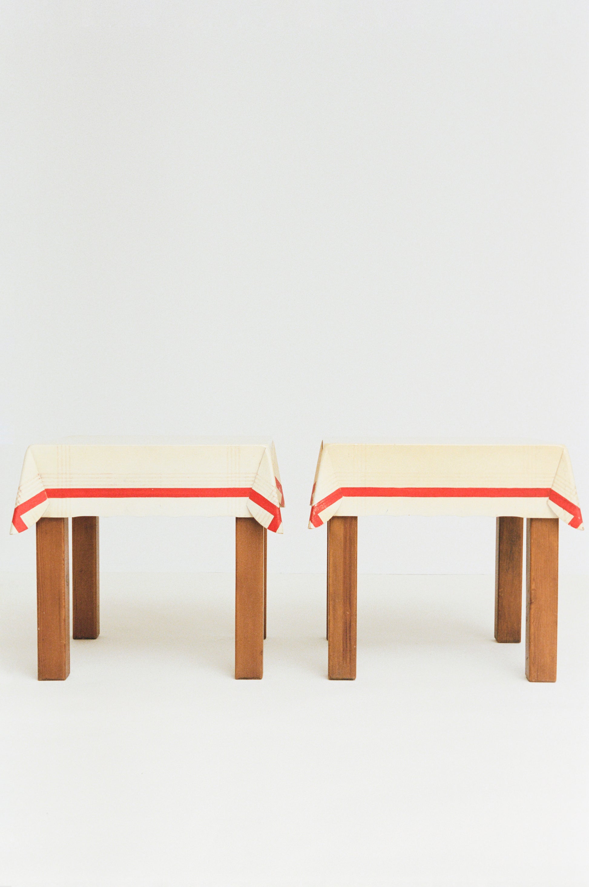 Made in Spain in the late 20th century, this Pair of Trompe l’Oeil Tables exemplifies an experimental approach to furniture design, inspiring a lively curiosity about abstraction, illusion, and materiality. Despite their visual suggestion of flatness or weightlessness, the tables are indeed three dimensional and physically quite substantial. The painted details and simplified edges – suggesting a table cloth atop a dining table – articulate a trompe l’oeil effect that humorously plays with perception.
