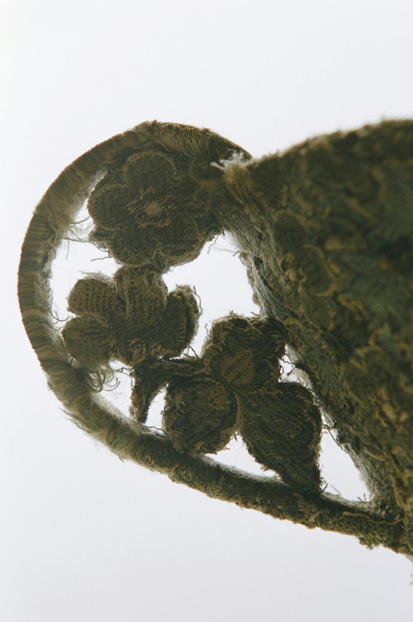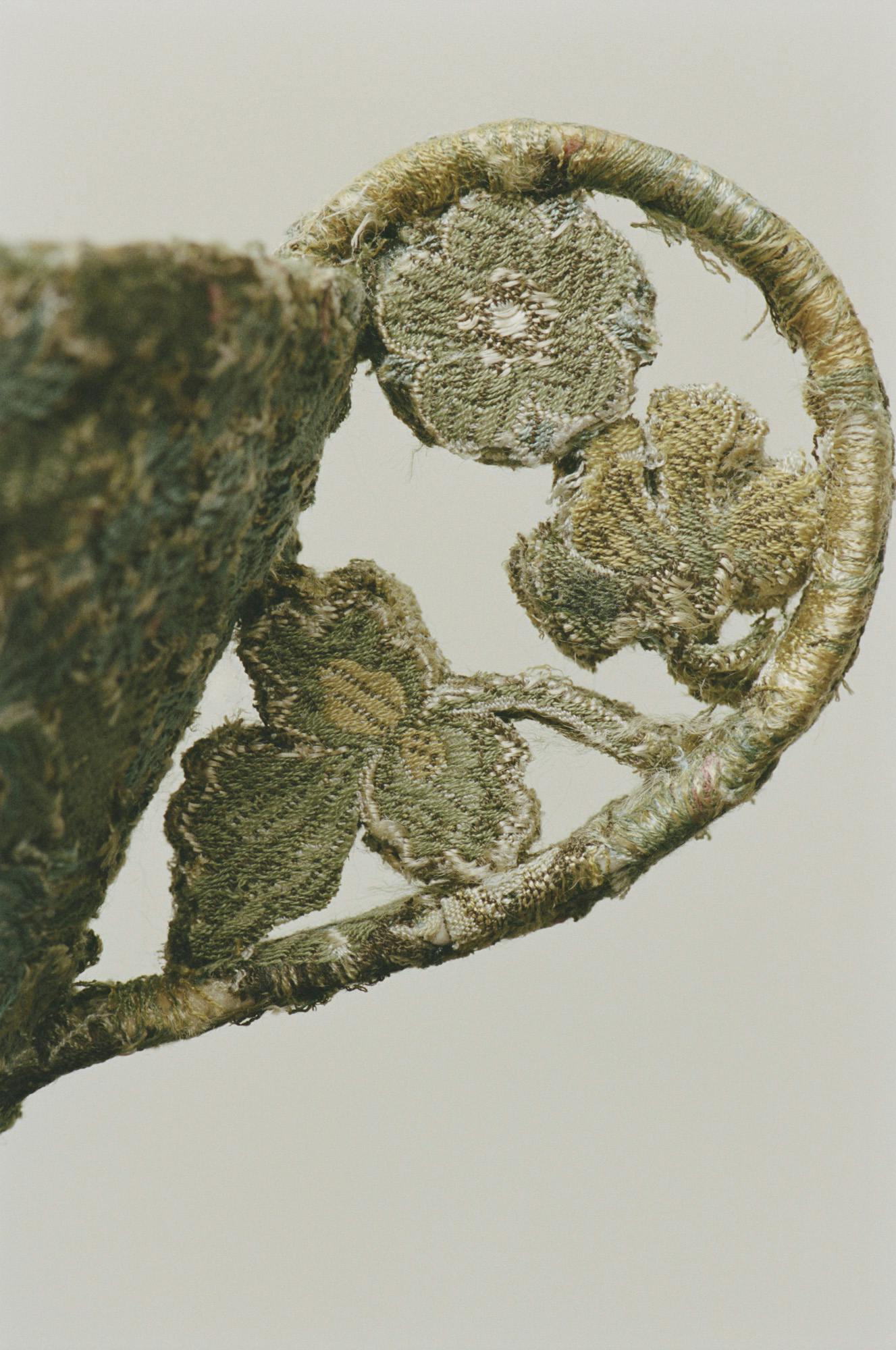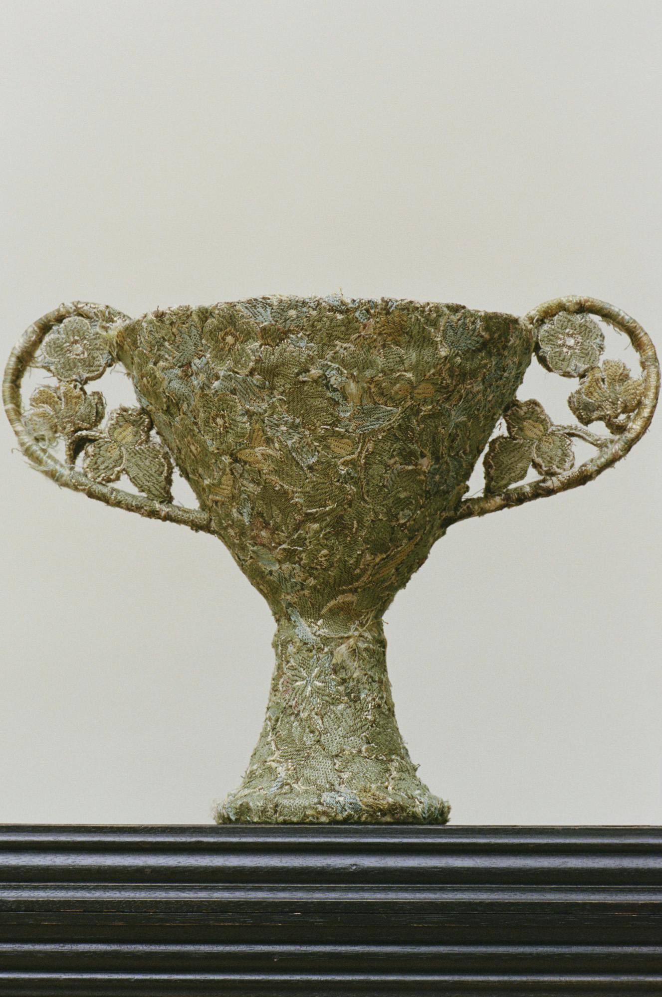 Rewoven Wassail by Cara Bauermeister is a classically shaped vessel enveloped in meticulously hand cut remnants of antique jacquard fabric. Awash in verdant leaves and flowers, the work references verdure tapestries and medieval mille-fleurs. The cup inspires thoughtful inquiry into notions of control of the natural world, fecundity, handcraft and domestic spaces.
