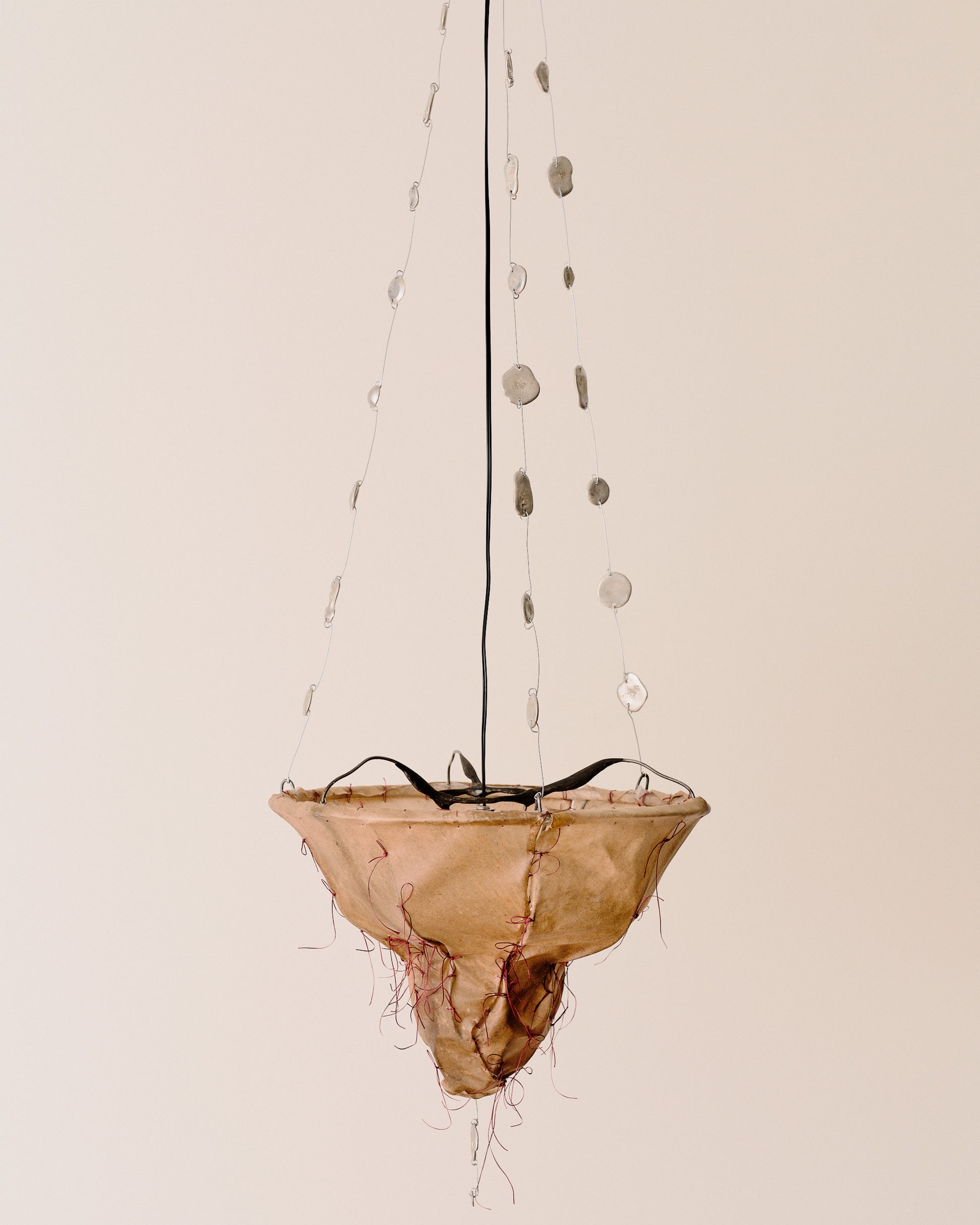 Sanctuary Lamp is built from a steel wire frame, stretched with sections of goat hide and bound with waxed thread. A chain of cast pewter links suspends a votive candle. The work draws inspiration from the sanctuary lamp, a fixture in both Jewish and Christian traditions, where a flame burns as a sign of divine presence. In Catholic churches, for example, a red candle represents Christ. In this pendant lamp, the red thread ties the votive candle, a quiet echo of the eternal flame. Goat hide—referenced in the Old Testament as material for the Tabernacle and ritual objects like Torah scrolls—further embeds scriptural resonance.