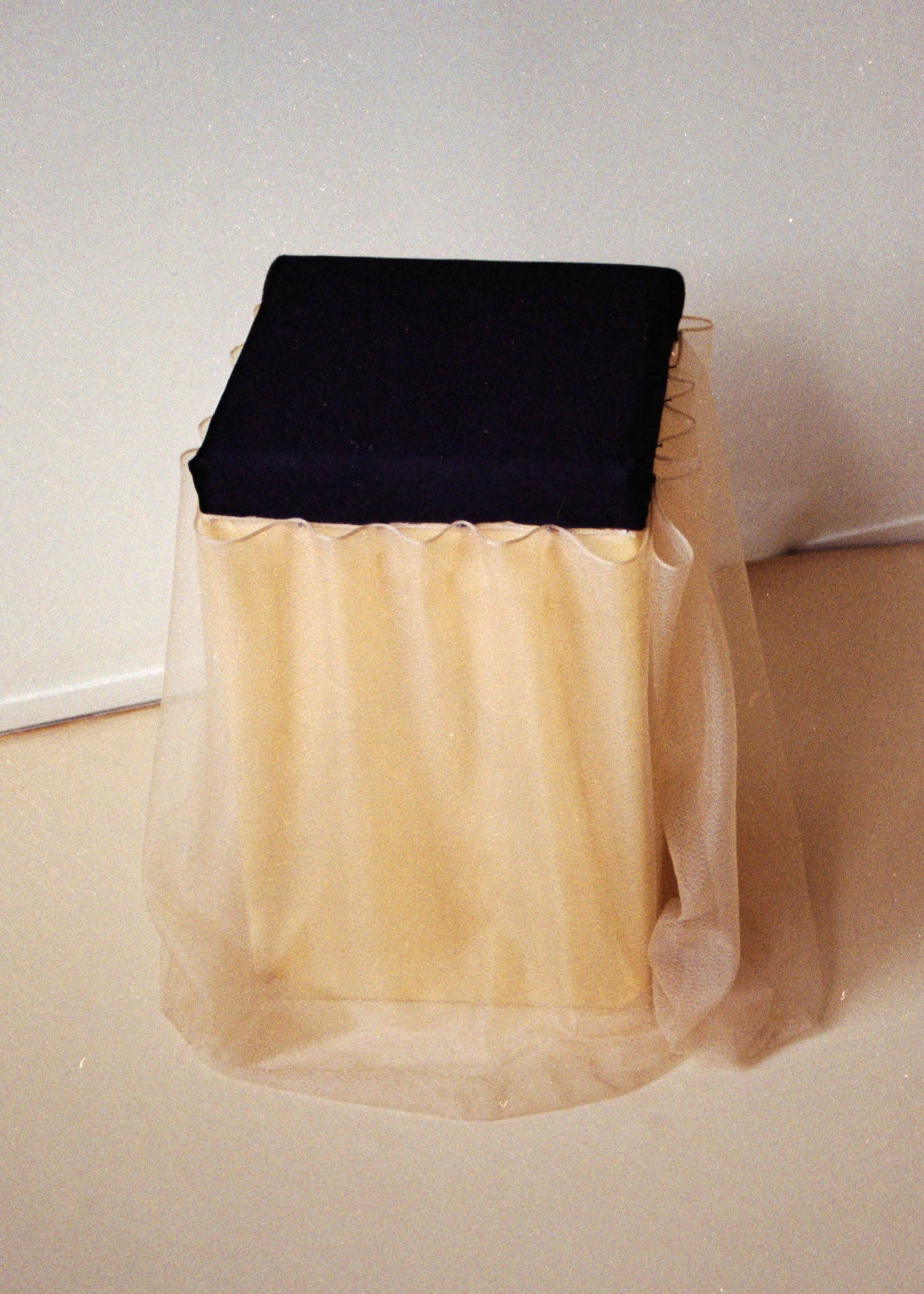 Bonino’s work investigates notions of ephemerality and memory, ideas of fastening – closure, disclosure and the tensions inherent in the nature of seemingly disparate materials – those very tensions present within ourselves.This functional stool is composed of wood, foam, nails and dressed in deadstock fabric.