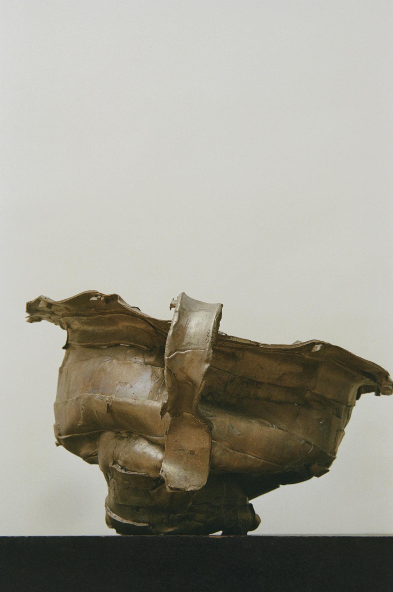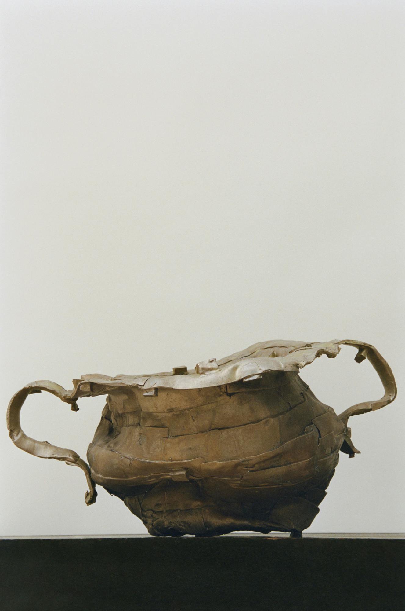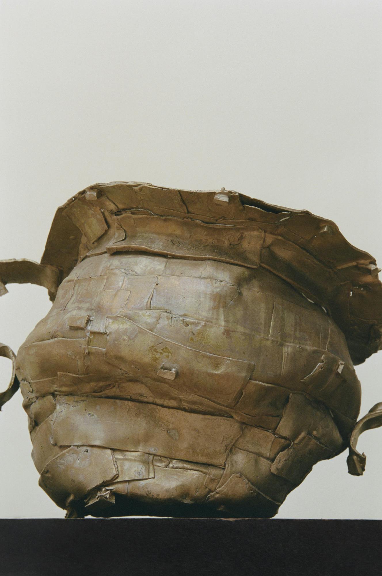 Stamnos by the artist Skye Chamberlain is a cast bronze vessel that appears to almost emerge from the smoldering earth. Inspired by the forms of Greek Stamnos or Amphora, the vessel is classical in form but also appears scrappy in its construction, hand built from a wax mold. Tilted and warped, faint fingerprints can be detected in the bronze finish, as evidence of the hand and a nod to the historical tradition of archival cultural preservation.Â