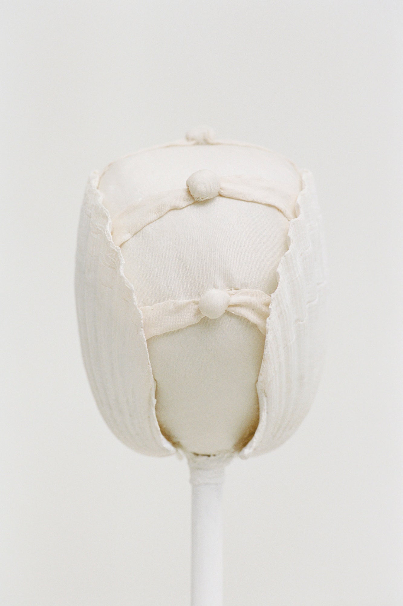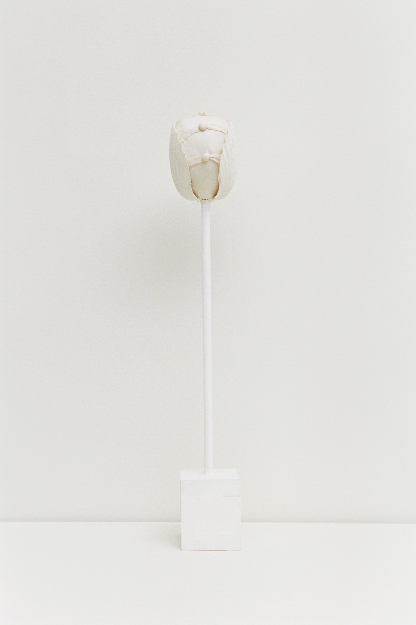 For “Play!”, artist Elliot Camarra’s works unfold around a loose narrative of a vessel far out at sea, where the horizon dissolves into a disorienting abstraction of water and sky. Subtle natural phenomena become harbingers of change, movement, and hope, guiding the imagined sailor through an otherwise endless landscape. This narrative is further articulated through sculptural forms that allude to the tradition of storytelling through stage scenery maquettes. The Verge of Seas to Be takes the form of a small, talismanic object, positioned somewhere between sculpture, souvenir, and navigational charm. Constructed from wood, paint, shells, fabric, wire, and glue, the work centers on a pair of scallop shells and is finished with delicately hand-stitched applique.