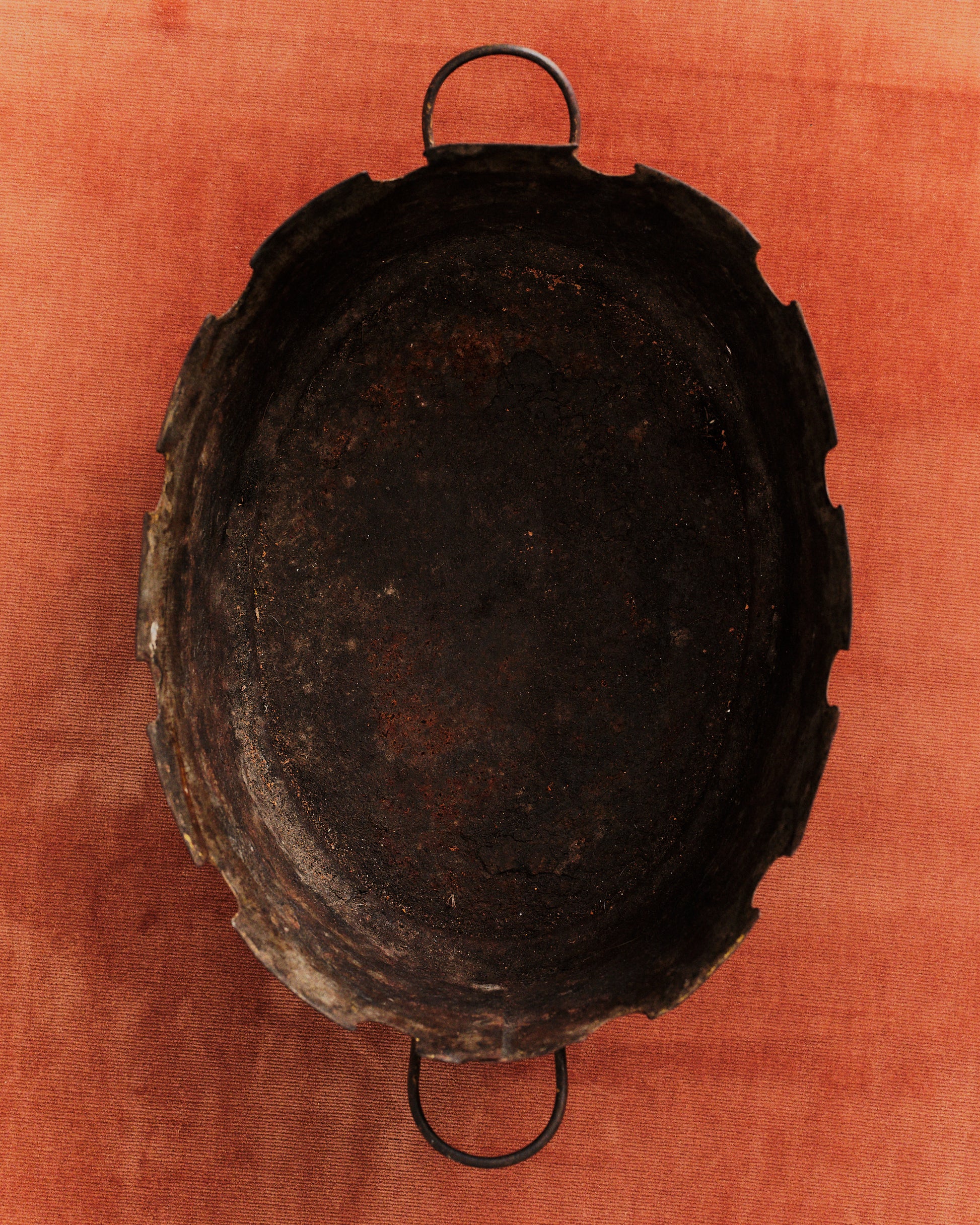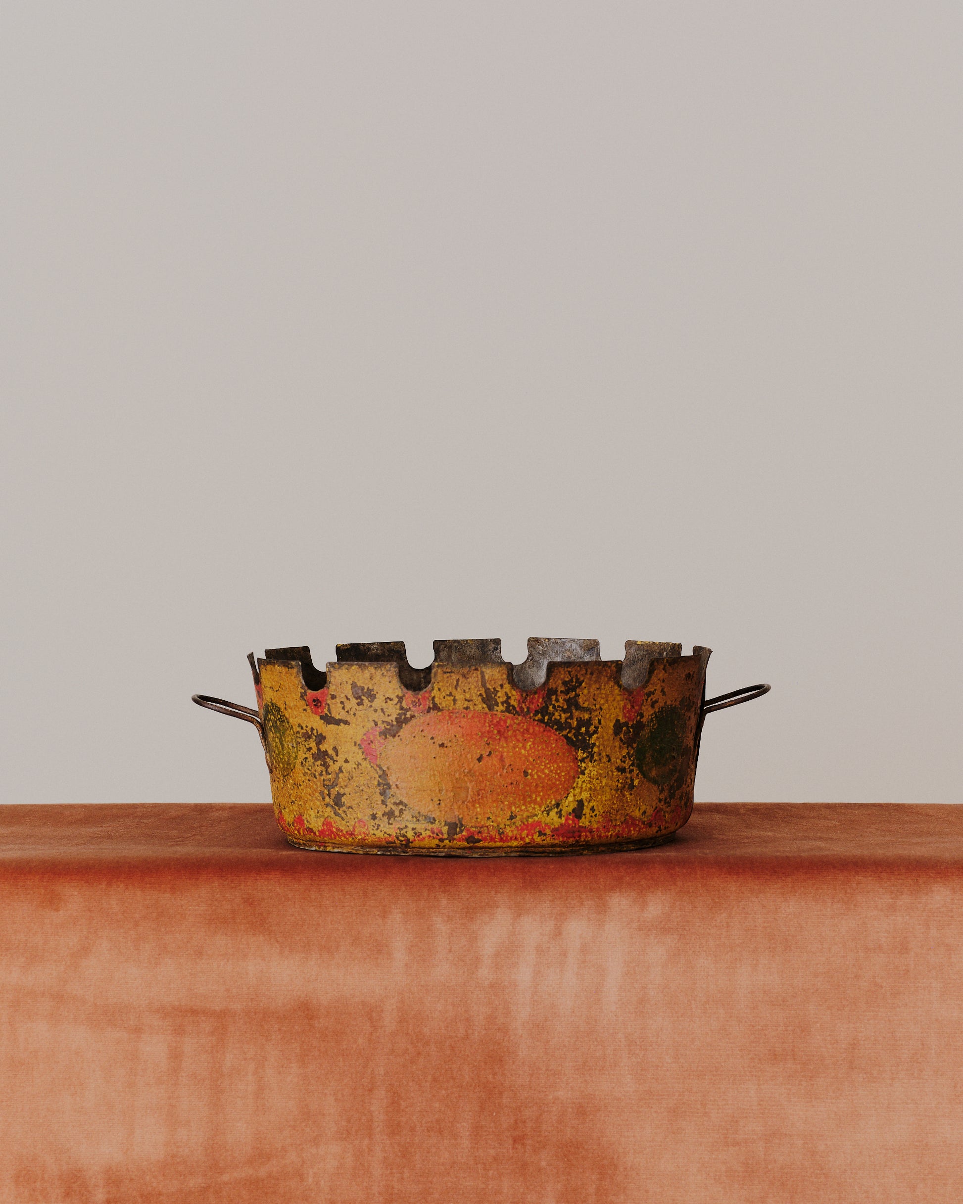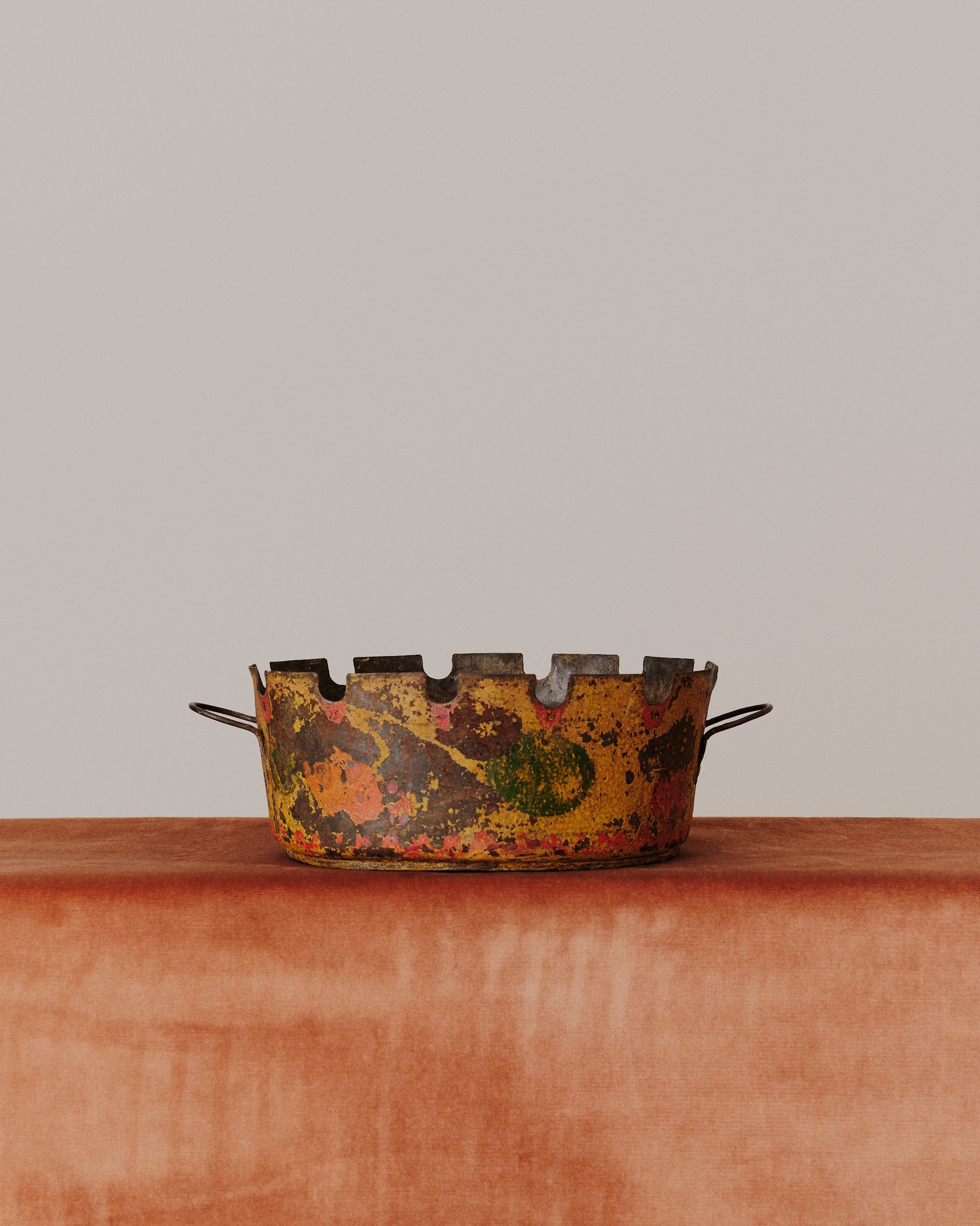 This tole painted cachepot originates from the 19th century, and exemplifies the decorative refinement of the French Empire style. Painted tole, also known as “tinware”, was very popular in France during the 19th century, and praised for its affordability and durability without the sacrifice of its ornamental appeal. Beautifully handpainted in crimson, mustard and forest green, the vessel’s crenellated rim evokes the architectural form of a medieval castle. The tray has cut-out handles integrated on either side for ease of use.