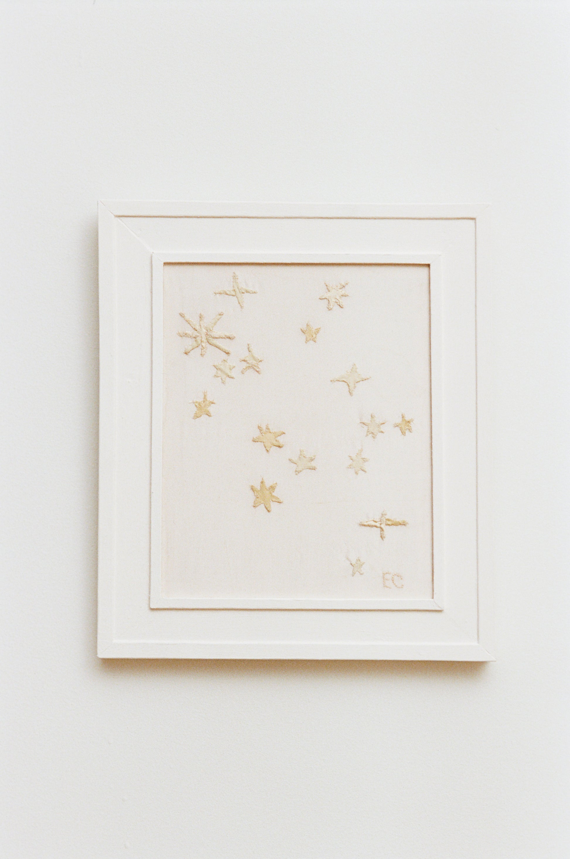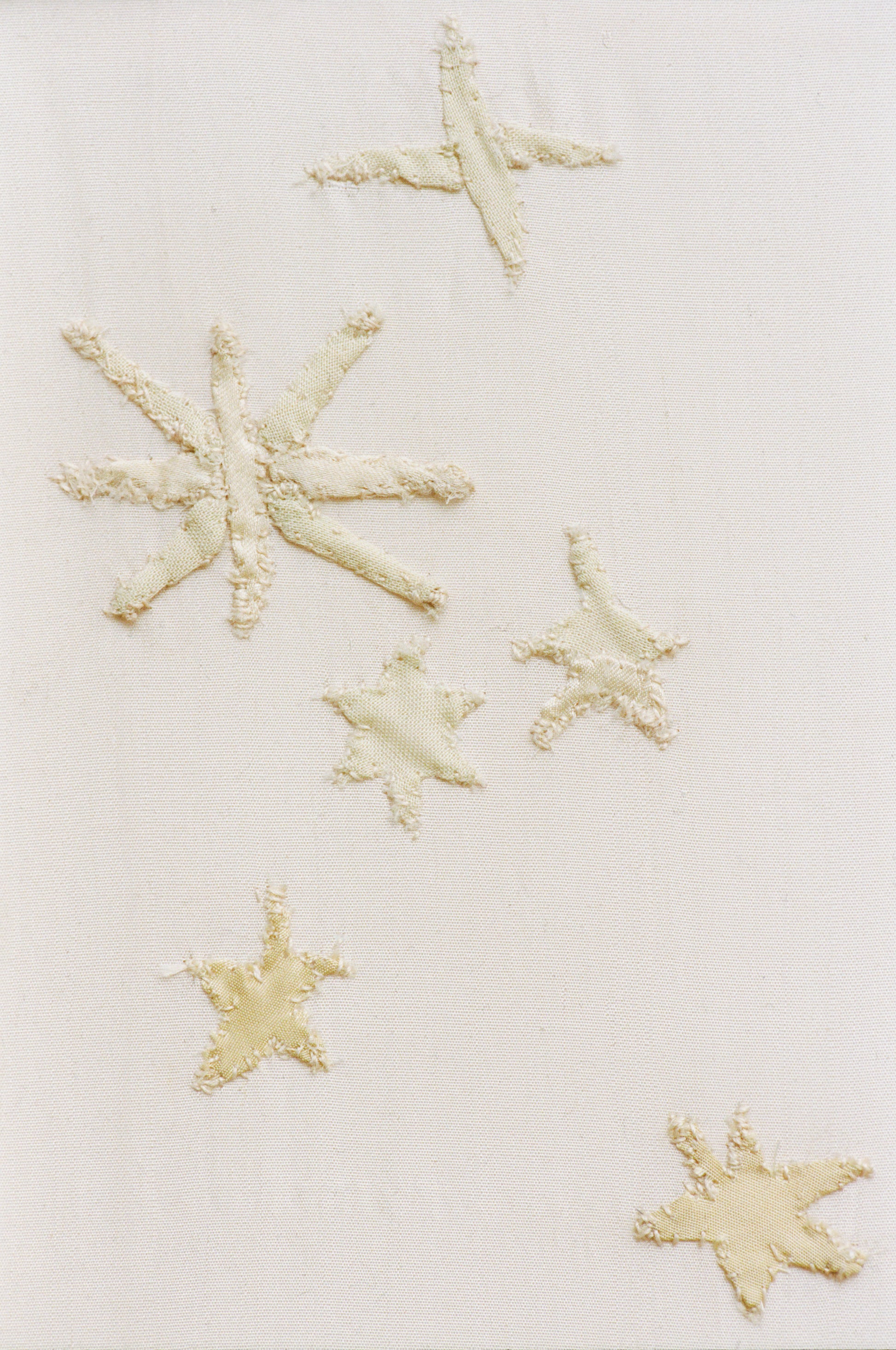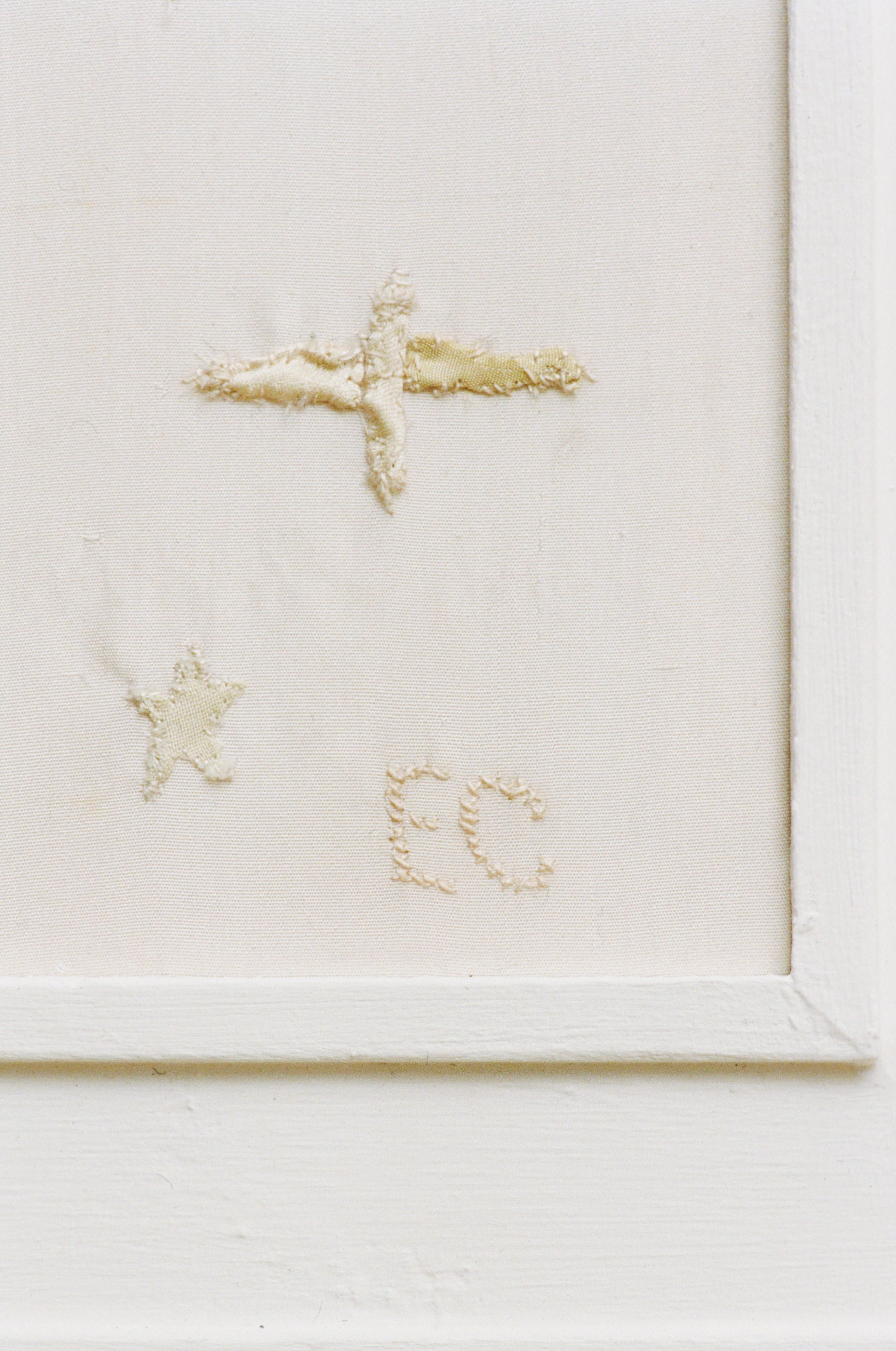 For “Play!”, artist Elliot Camarra’s works unfold around a loose narrative of a vessel far out at sea, where the horizon dissolves into a disorienting abstraction of water and sky. Subtle natural phenomena become harbingers of change, movement, and hope, guiding the imagined sailor through an otherwise endless landscape. This narrative is further articulated through sculptural forms that allude to the tradition of storytelling through stage scenery maquettes. View from the Deck is constructed from layered vintage fabrics such as silks, satins, and cottons. The work depicts the constellation of the Dioskouroi (Gemini), mythological twins revered in ancient Greek culture as protectors of sailors. The handmade, custom-painted wooden frame reinforces the work’s intimate scale, evoking a window or porthole.