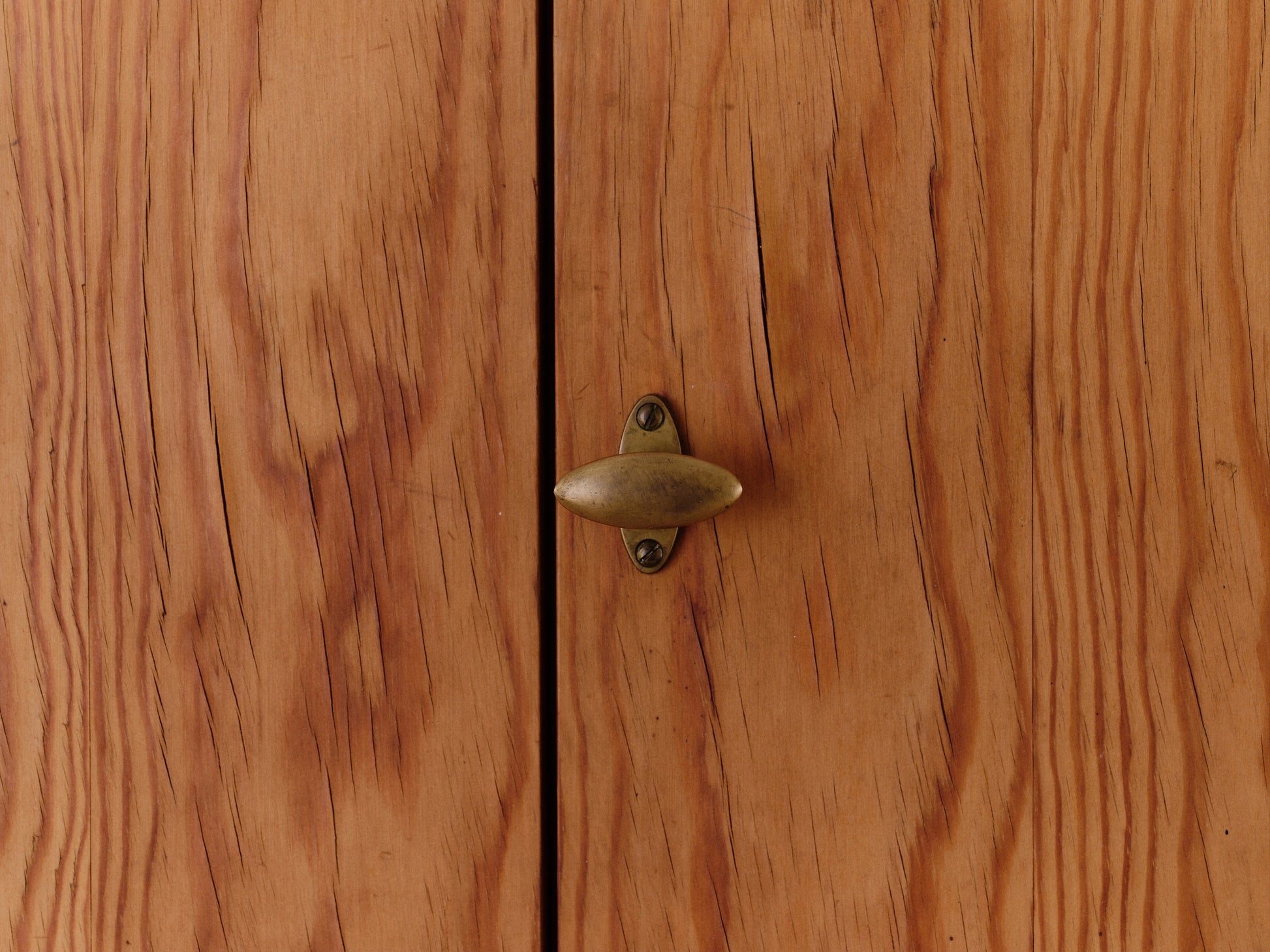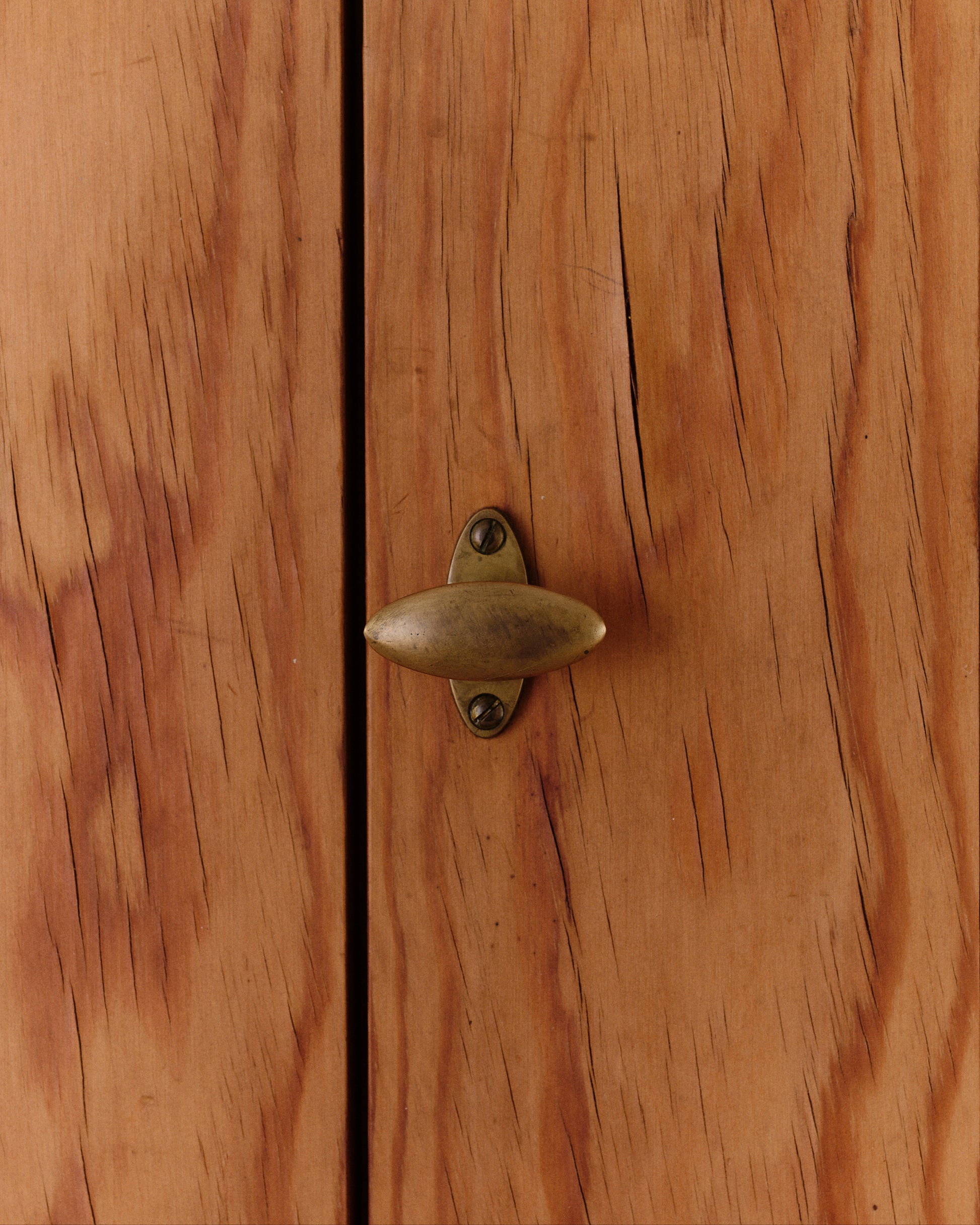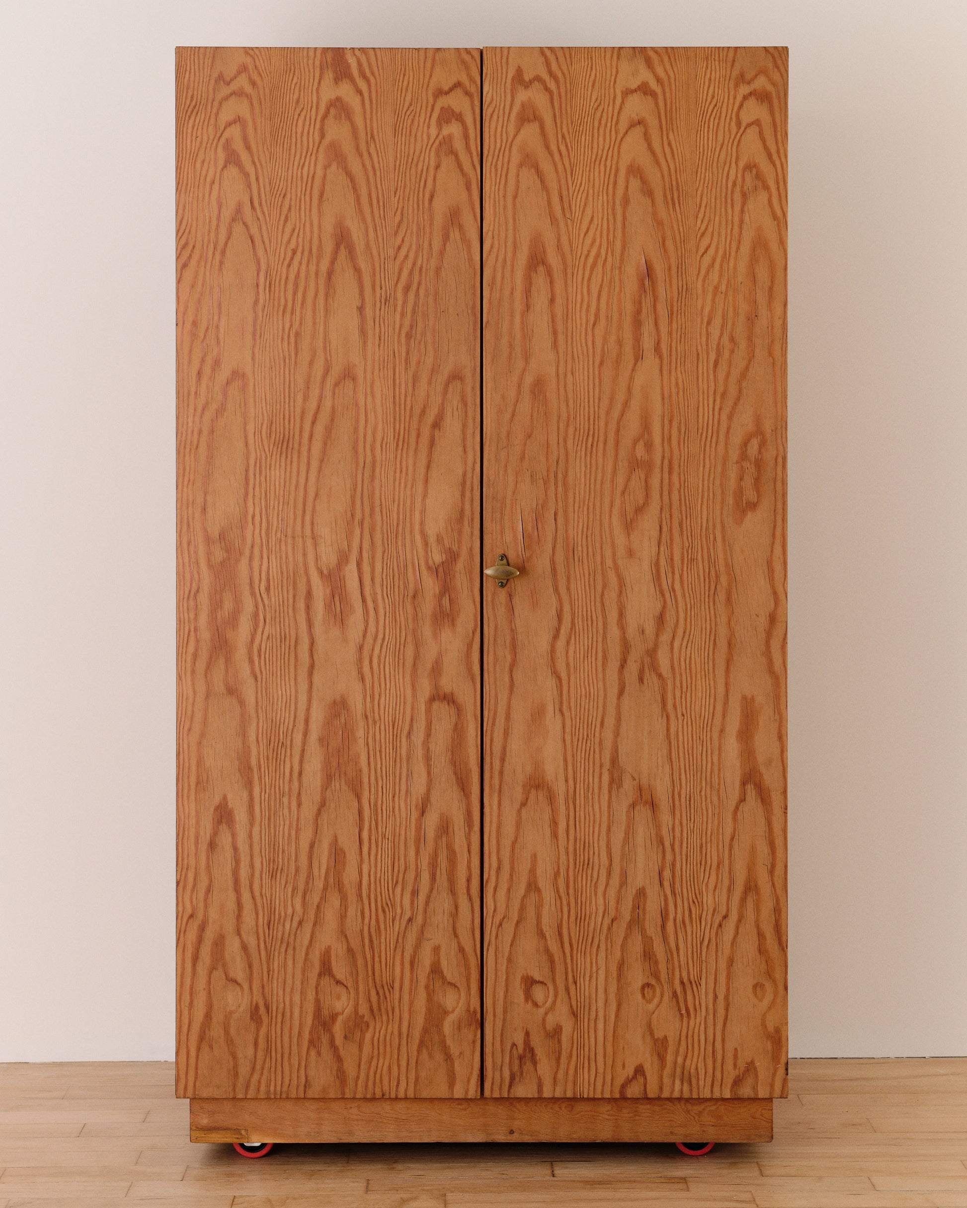 This handsome wardrobe was made in Denmark around 1970. Composed of warm grained pine, the surface pattern evokes the delicate texture of silk moiré fabric. The refined brass pull complements the simplicity of its construction, exemplifying the elegance of Scandinavian craftsmanship. Thoughtfully designed for both functionality and form, the wardrobe’s versatile interior features five adjustable shelves, one fixed shelf and a coatrack.