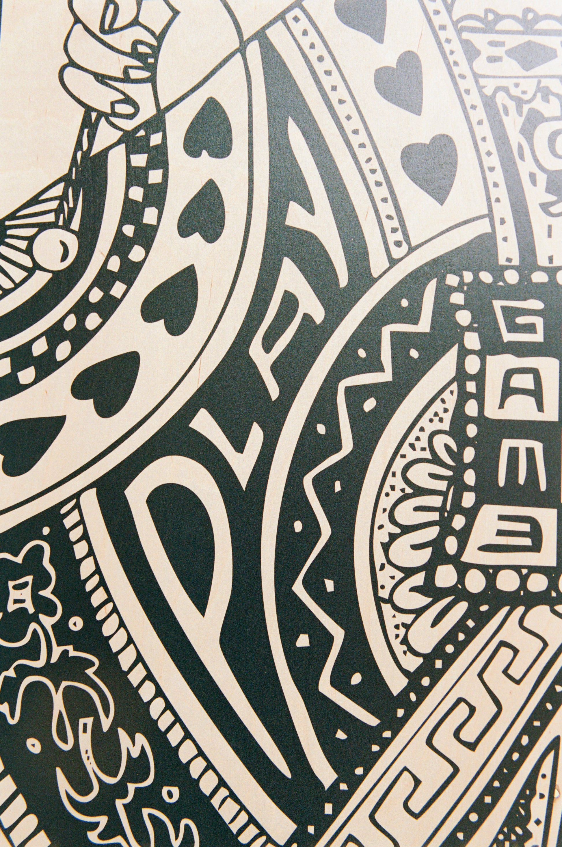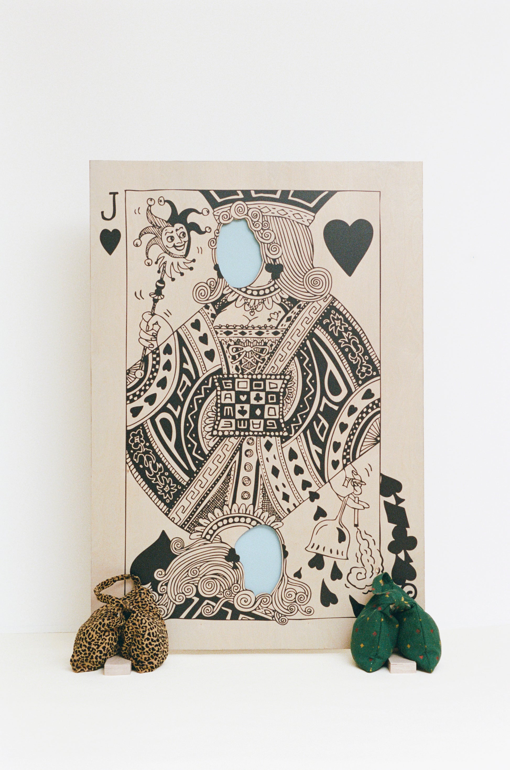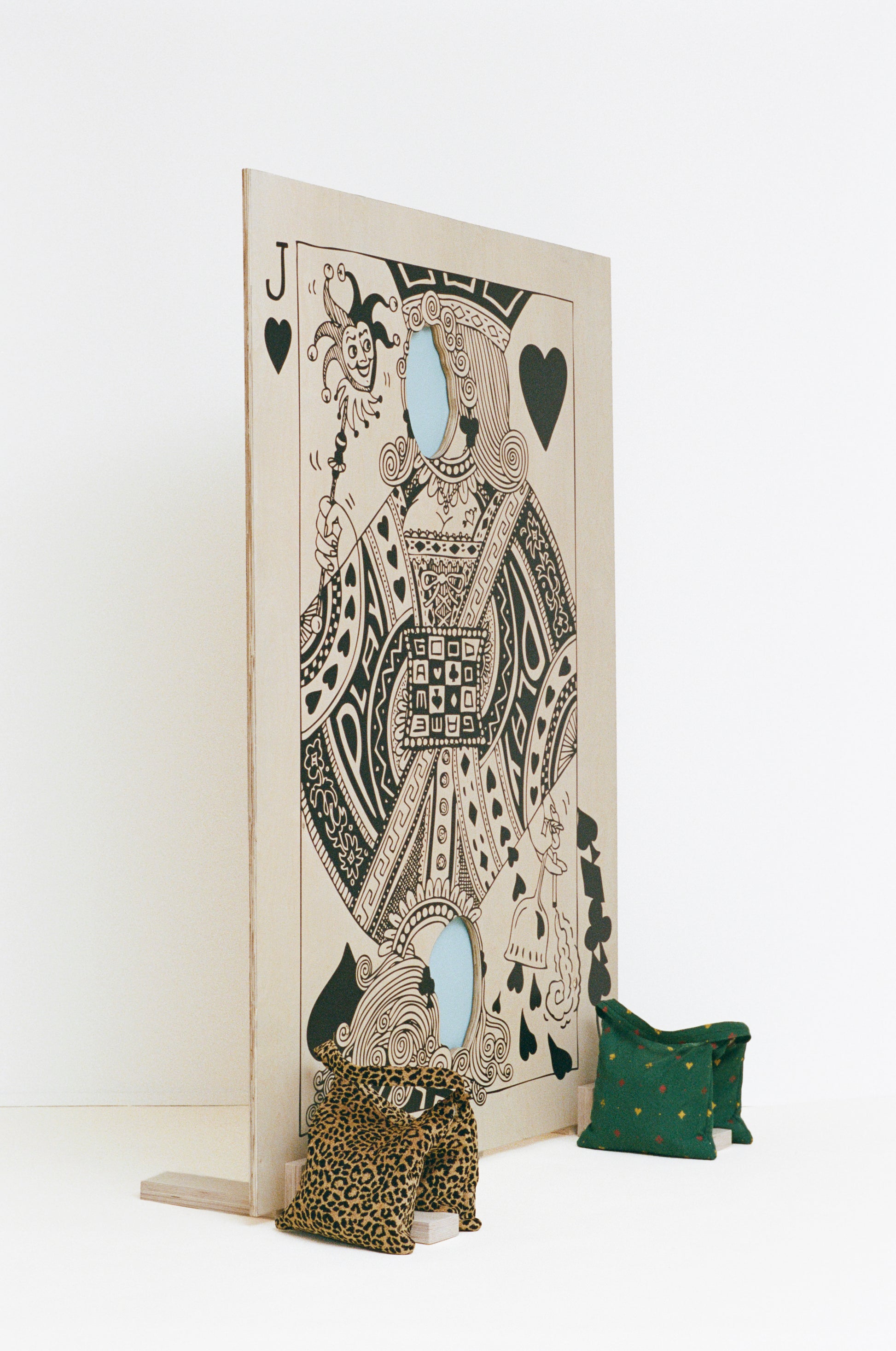 Face-in-Hole boards (also known as peep boards) are typically slapdash paintings on plywood, punctured with holes sized for a face and weighed down with sandbags. Historically they are seen at seaside tourist destinations, a corn maze or strawberry festival, on a boardwalk, or any place with a whiff of a carnival. For PLAY!, artist and illustrator Joana Avillez created these works as a way to punctuate and activate the gallery space while allowing for a cheeky and mischievous way in which to interact with the exhibition. The three boards in PLAY! are all directly inspired by other works in the exhibition. Trenchcoat Trick references Ettore Sottsass’s Synthesis 45 Coat Rack, while Wonky Pip alludes to the cigarette case adorned with “vices”. Last but not least, the diminutive Four-Legged Fruit draws from the collection of silver betel boxes and is the perfect scale for a dog or cat, kneeling child or a particularly adventurous adult!